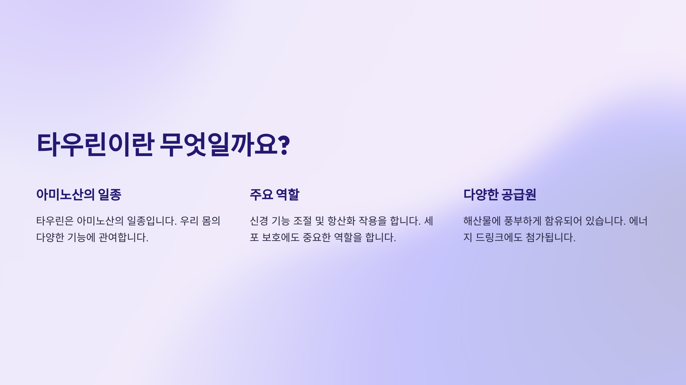 타우린(Taurine)은 우리 몸에서 자연적으로 생성되는 아미노산 유사 성분으로, 세포 기능을 조절하고 에너지 생산을 돕는 중요한 역할을 해요.