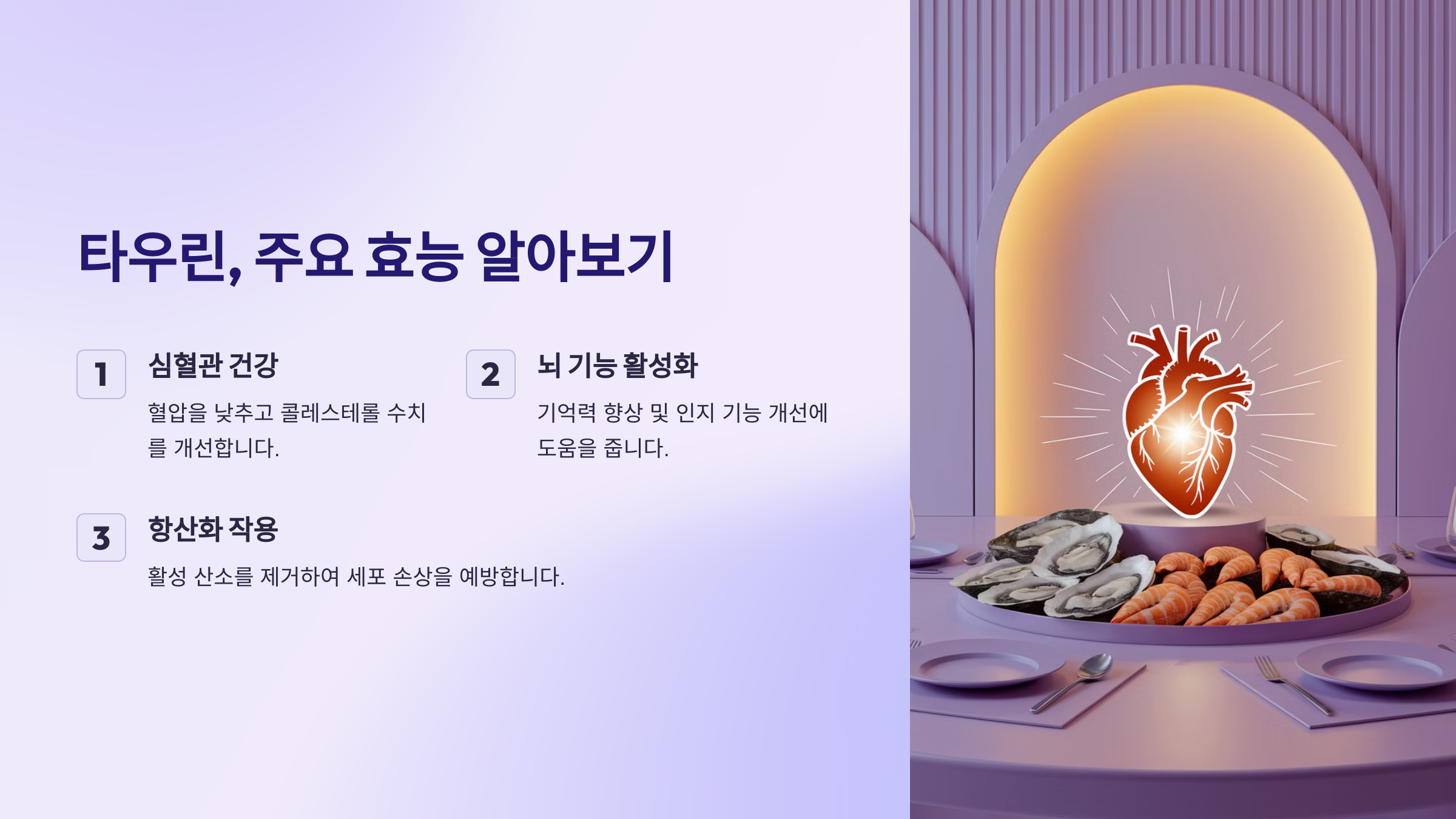 타우린은 피로 회복뿐만 아니라, 심장 건강, 신경 보호, 운동 능력 향상 등 다양한 역할을 해요. 실제 연구에서도 여러 가지 건강 효과가 입증되었어요!