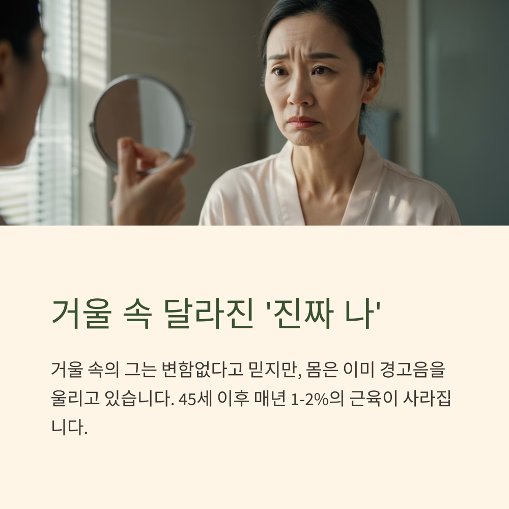 중년은 바쁘다. 회사에서도, 가정에서도, 모두가 그에게 기대고 있고, 그는 늘 자신의 몸을 뒤로 미룬다. 약간의 피곤함은 커피로 넘기고, 무릎 통증은 ‘그냥 쉬면 낫겠지’라고 생각하며 지나친다. 하지만 그것이 근육이 사라지고 있다는 신호라는 걸 깨닫기까지, 너무 많은 시간을 소비한다. ‘괜찮다’고 넘긴 순간들이 모여, 어느 날은 다시 일어나지 못하는 ‘진짜 위기’로 이어진다.