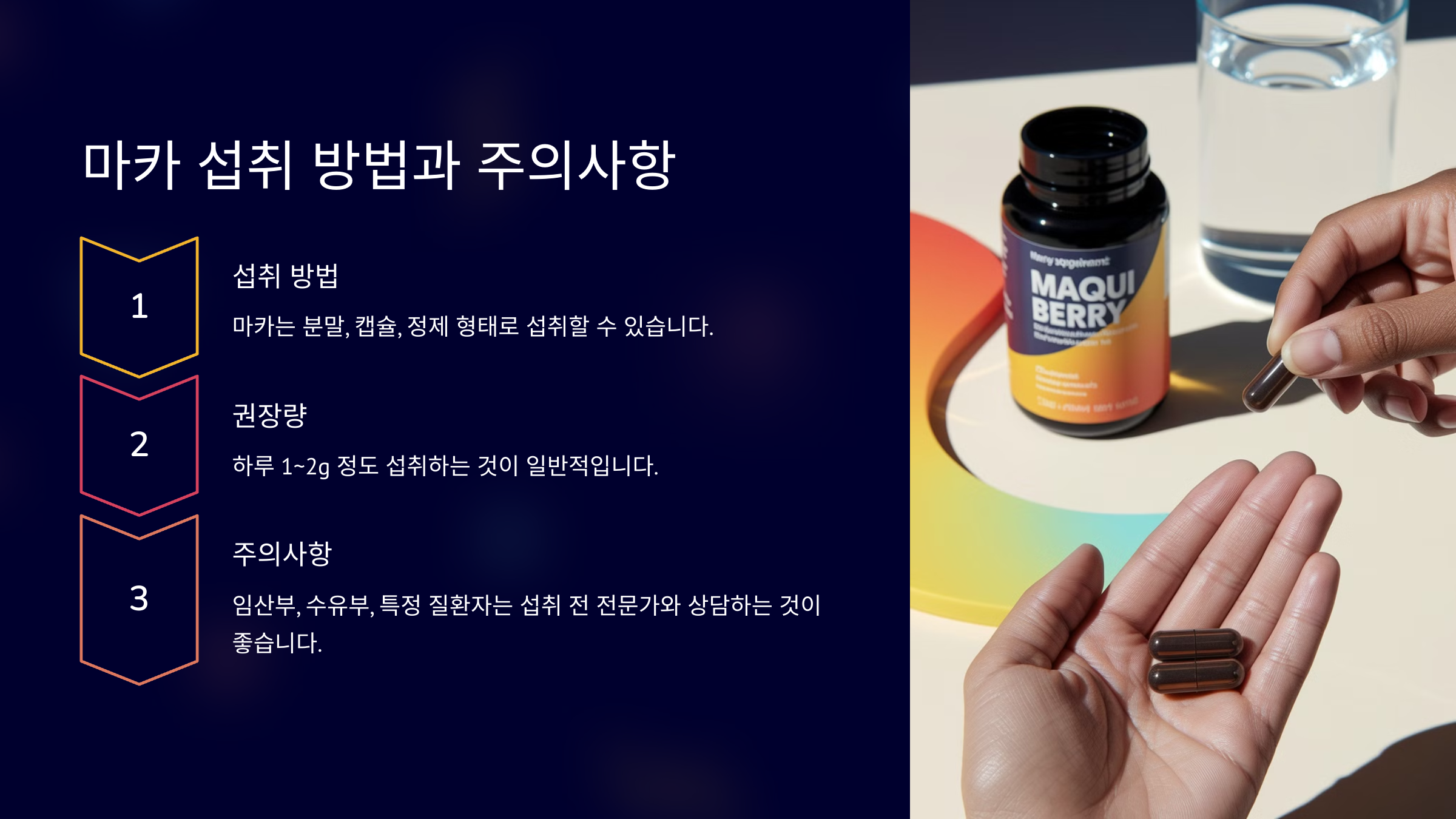 마카 분말은 **스무디, 요거트, 오트밀** 등에 넣어서 섭취할 수 있고, 캡슐 형태는 간편하게 하루 한두 알씩 복용하면 돼요. 또한 마카 추출액은 물이나 차에 섞어 마시는 방법이 있어요.