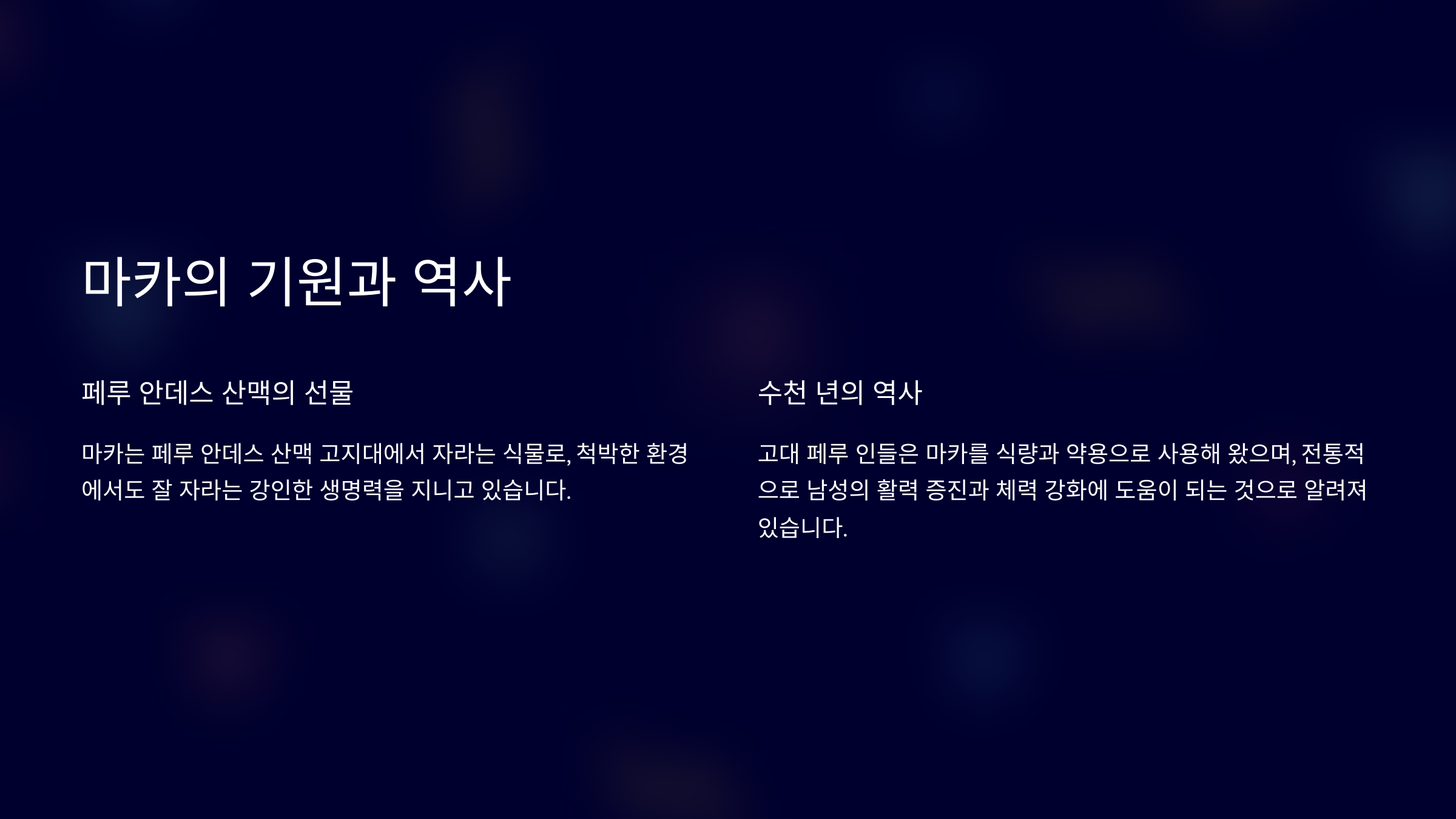 마카는 약 2000년 전부터 페루의 원주민들이 재배해온 귀한 식물이었어요. 특히 잉카 문명에서는 군인들이 전투 전에 마카를 섭취하며 체력과 정신력을 강화했다고 전해져요.