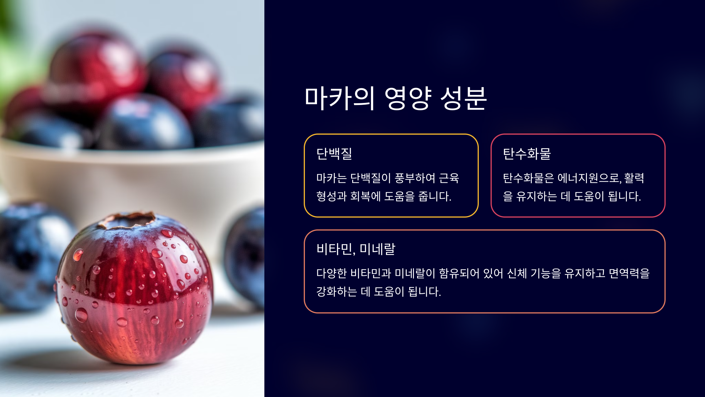 마카에는 단백질, 식이섬유, 다양한 미네랄이 풍부하게 들어 있어요. 특히 철분, 칼슘, 아연 등이 많아 남성의 활력을 높이는 데 도움이 된답니다.