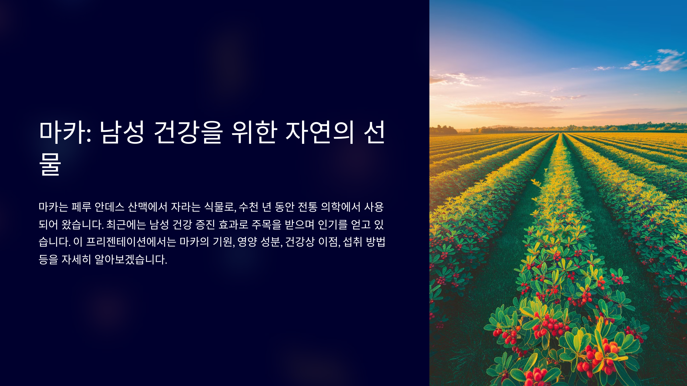 마카가 어떻게 남성의 활력을 높이는지, 어떤 영양소가 들어 있는지, 그리고 섭취 시 주의할 점은 무엇인지 자세히 알아볼게요. 😊