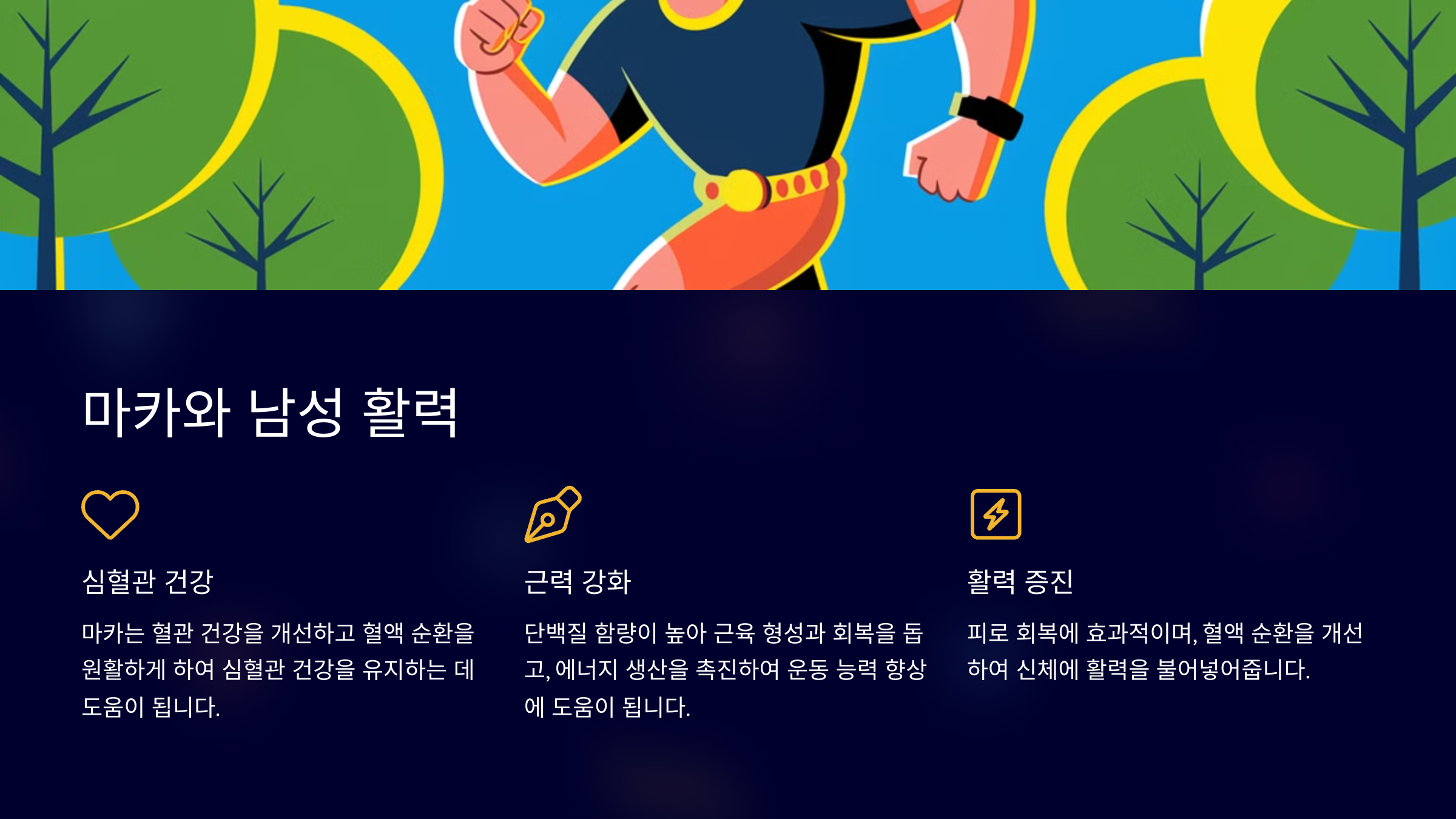 또한 마카에는 아미노산과 천연 식물성 스테롤이 포함되어 있어 근육 회복과 에너지 증진에도 좋아요.