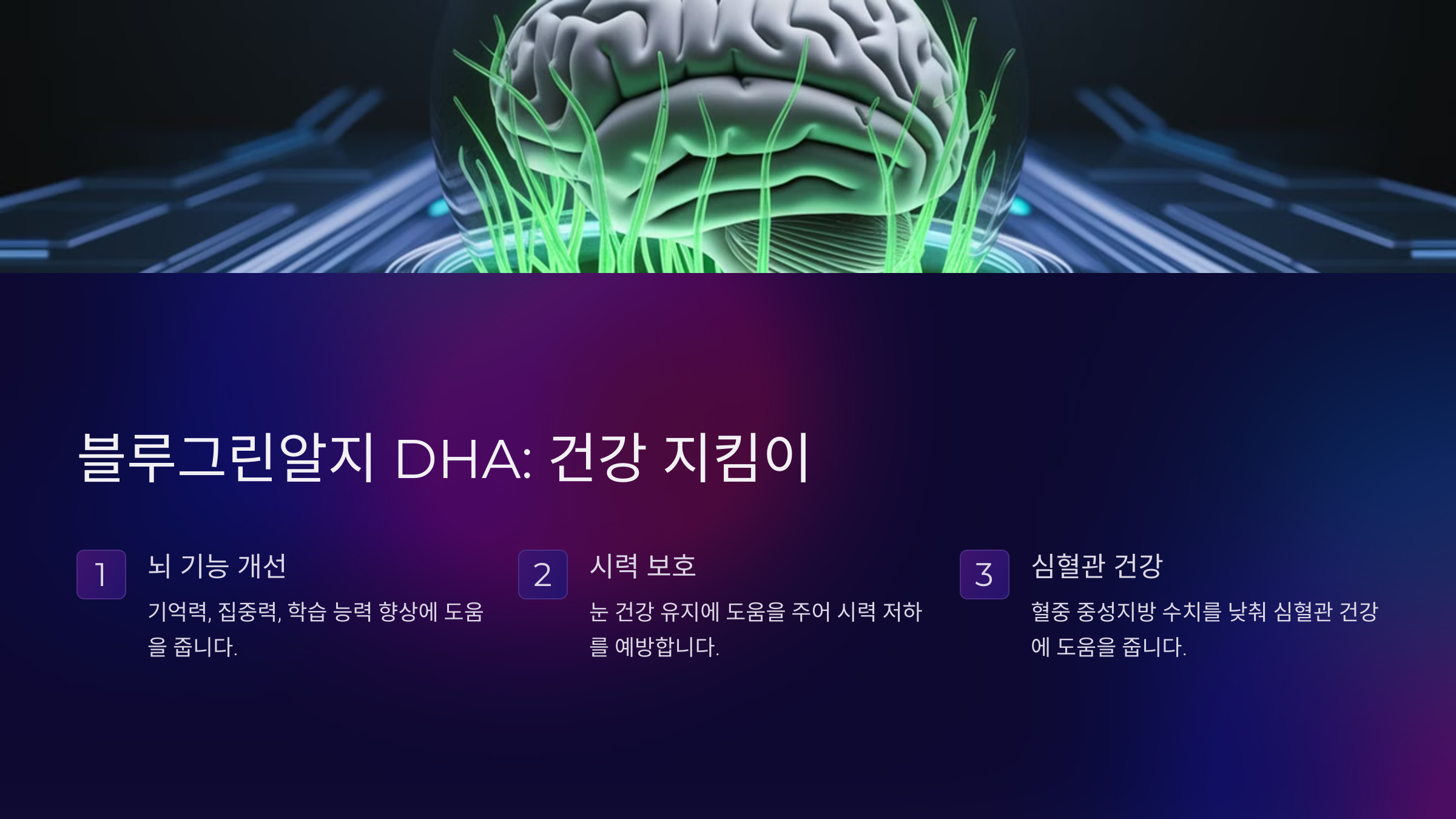 이처럼 블루그린알지 DHA는 종합적인 영양 효과를 제공하며, 특히 뇌 건강을 중시하는 분들에게 추천할 수 있어요.