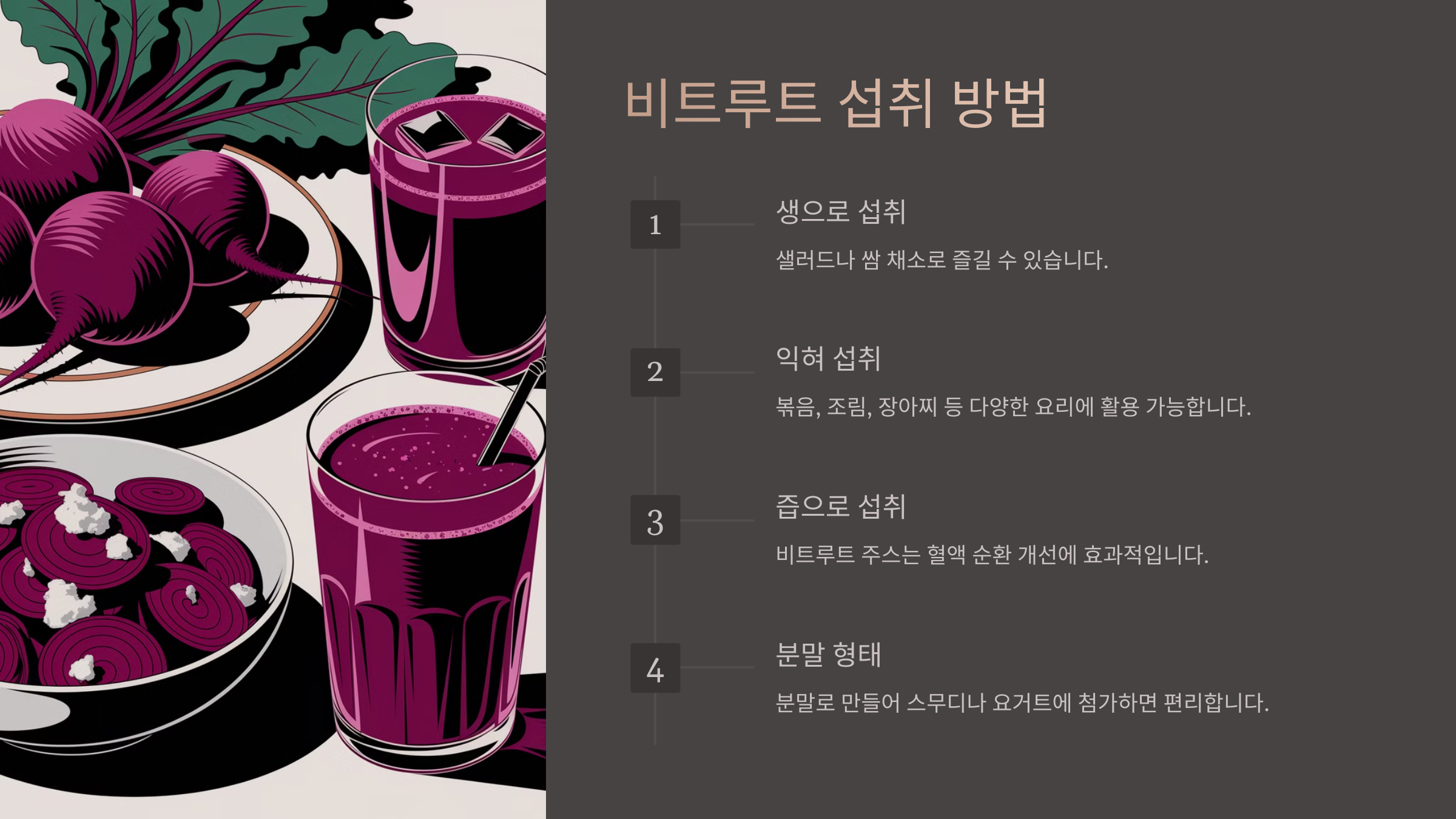 비트루트는 다양한 방법으로 섭취할 수 있어요. 생으로 먹거나, 주스로 만들어 마시거나, 요리에 활용하는 등 **자신의 취향에 맞게 즐기면 돼요!**