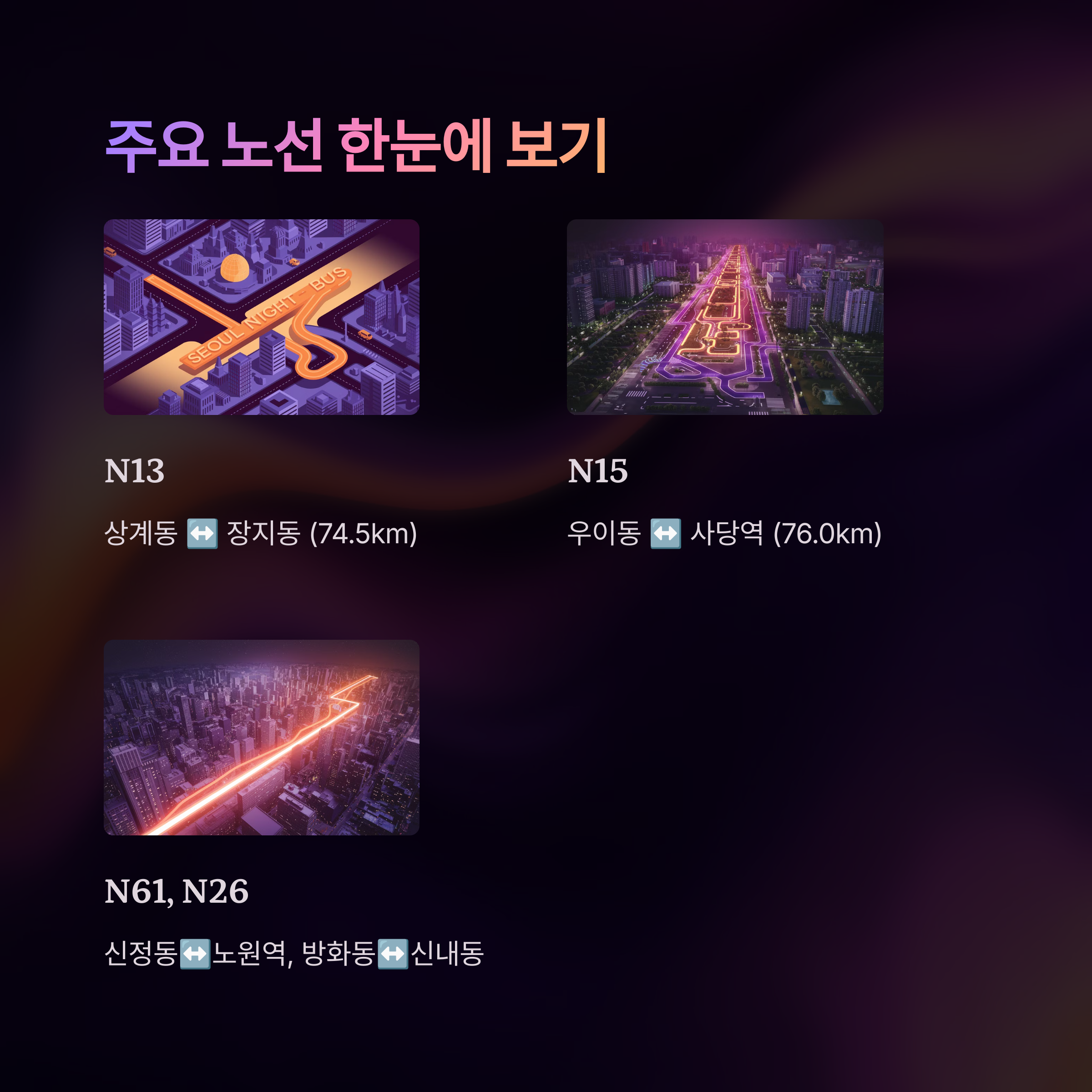 예를 들어 N26번은 강서구 화곡동에서 출발해 마포, 종로, 동대문을 지나 중랑구 면목까지 이어져요. N37번은 은평구 진관동에서 출발해 신촌, 강남, 송파구까지 이어지는 아주 긴 거리의 노선이에요. 강북과 강남 모두 통과해서 가장 인기 있는 노선 중 하나예요.