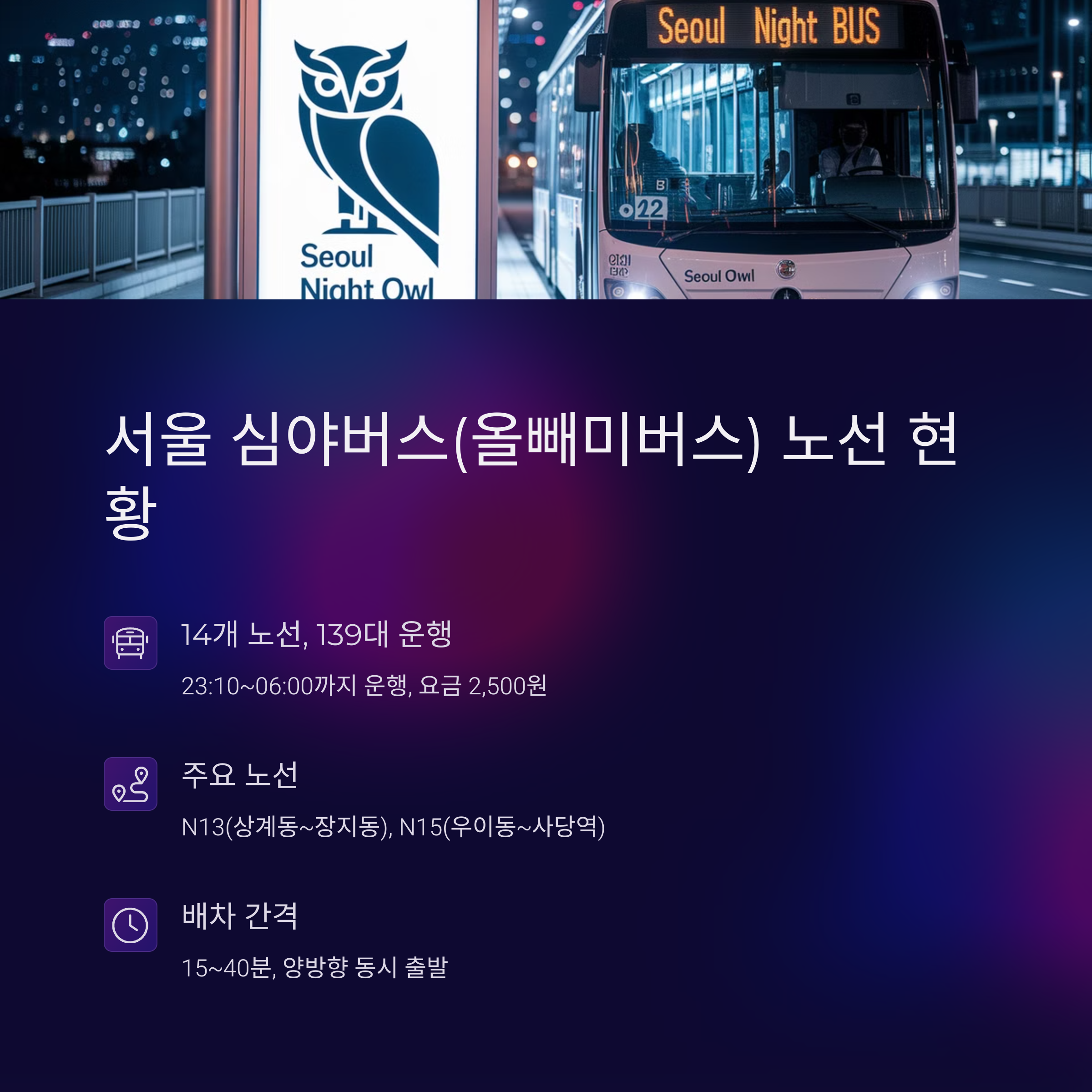 그럼, 서울 심야버스에 대해 하나하나 알아보면서 밤늦은 이동도 걱정 없는 서울 생활을 시작해볼까요?
