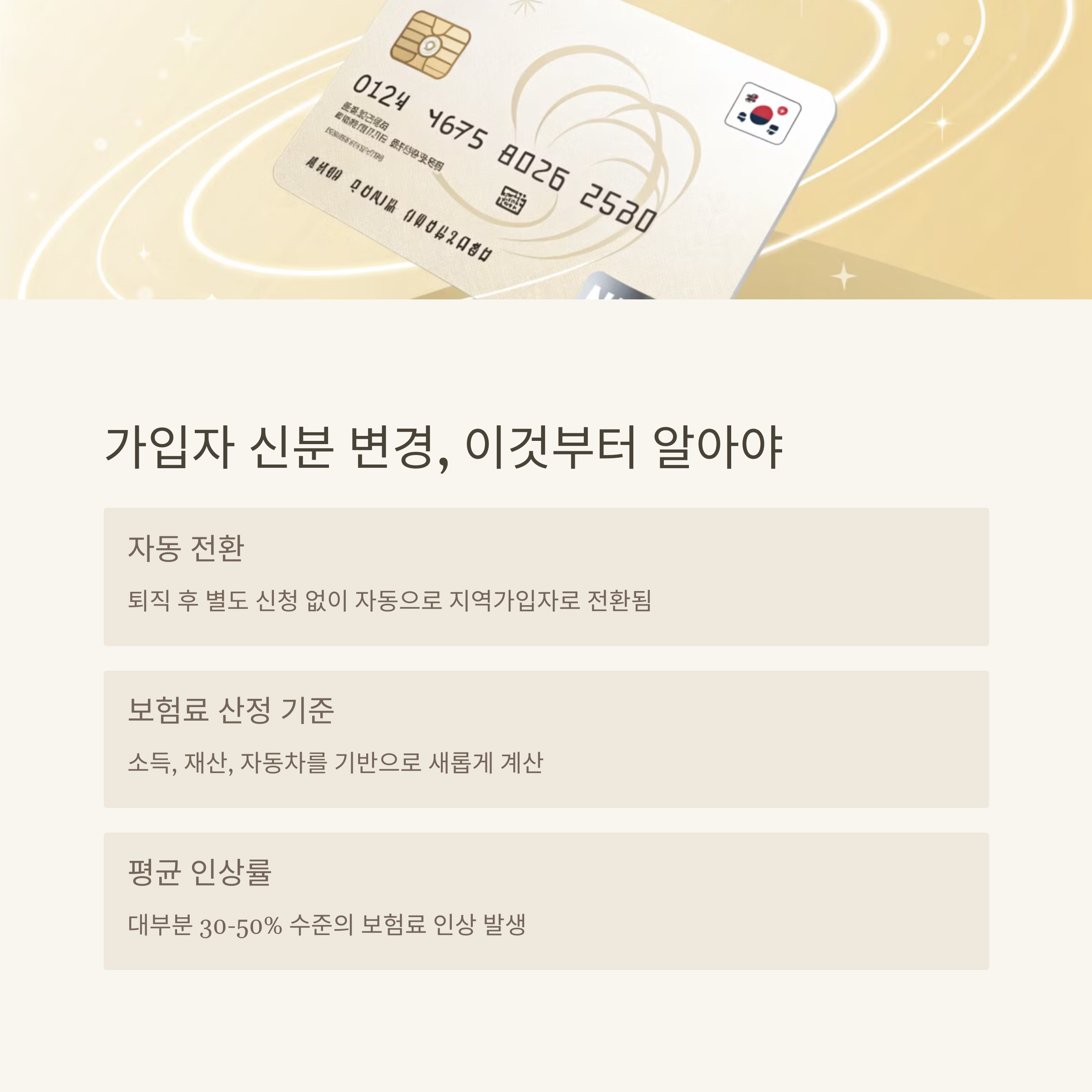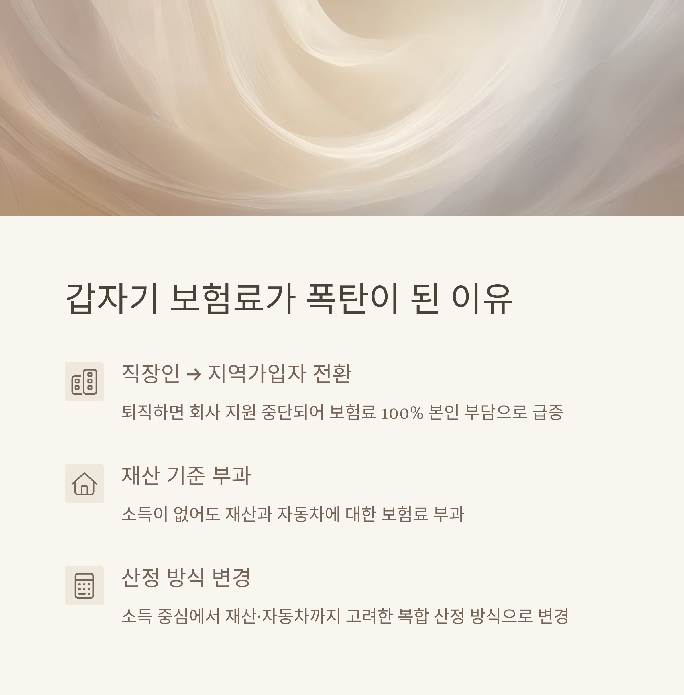 직장에서 퇴사하면 건강보험 자격이 직장가입자 → 지역가입자로 자동 전환돼요. 문제는 지역가입자의 보험료는 소득뿐 아니라 재산, 자동차 보유 여부까지 반영된다는 거예요. 이 때문에 퇴사 후 보험료가 갑자기 2~3배 뛰는 경우도 생겨요.