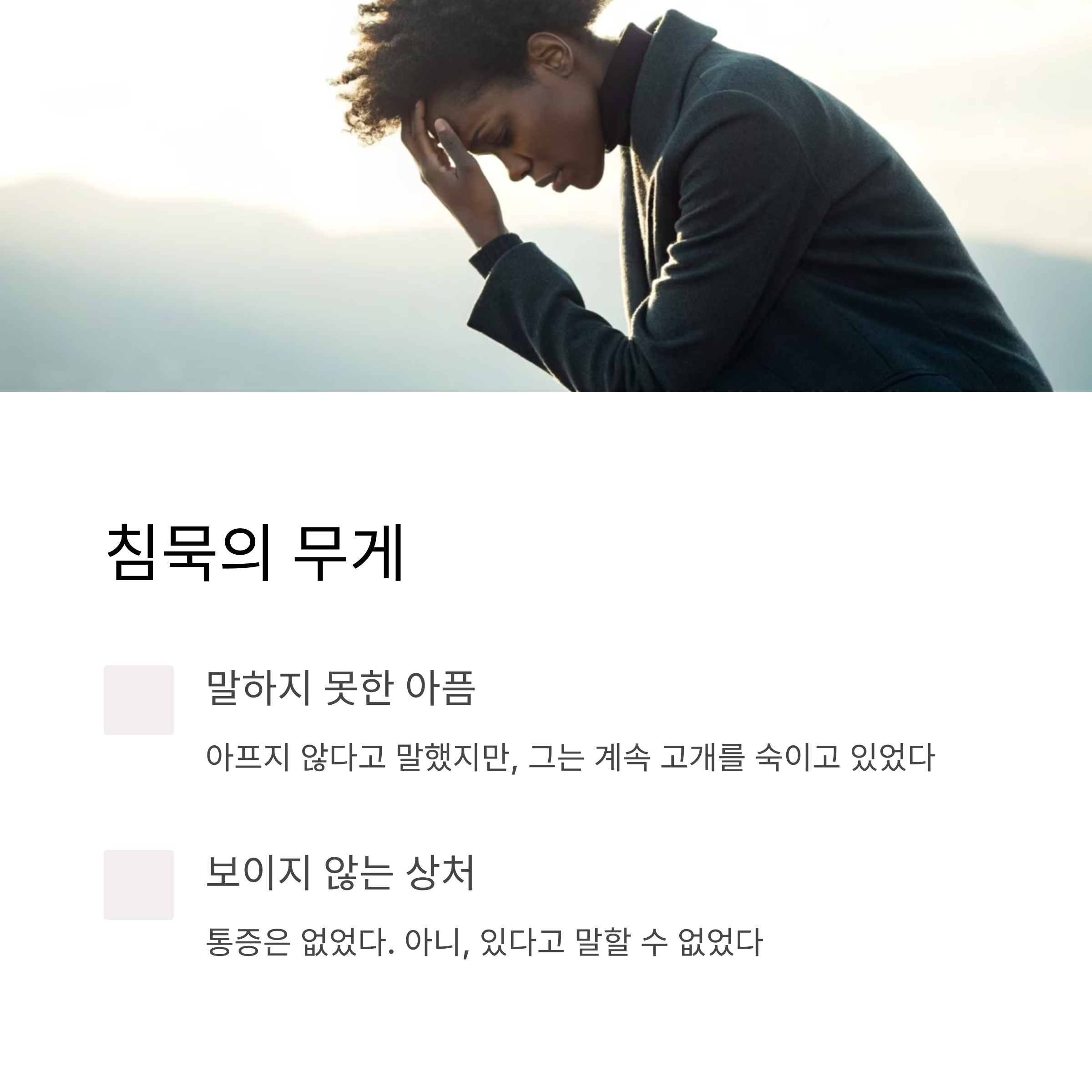 그는 몇 달째, 설명하기 힘든 고통을 겪고 있었다. 병원을 찾아가도 엑스레이는 정상이었고, 피검사에서도 아무런 이상이 없었다. 의사는 “스트레스 때문일 수도 있다”며 진통제를 처방해 주었고, 주변 사람들은 “그 정도는 다 겪는다”라고 말하며 웃었다. 그런데 그는 웃을 수 없었다. 마치 바늘이 피부 속을 긁고 지나가는 것 같은 감각, 밤이 되면 더욱 날카로워지는 쑤심, 문득 스치는 통증에 몸이 움찔하는 순간들. 그 모든 고통은 눈에 보이지 않았지만, 너무도 확실하게 존재하고 있었다.