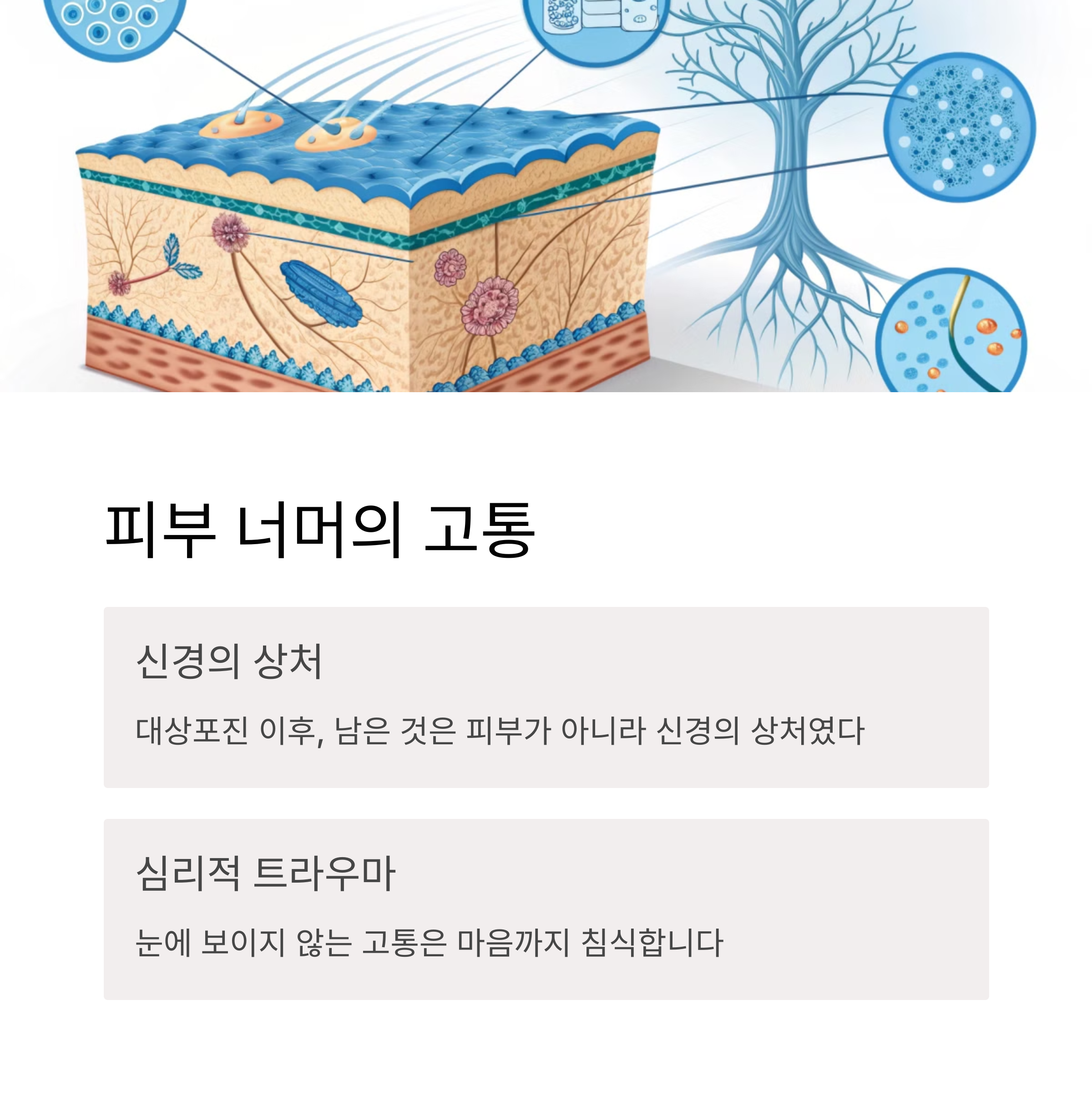 환자들은 종종 이런 말에 상처받는다. “그 정도로 아픈 거 가지고 왜 그래?”, “그건 마음의 병이야.” 하지만 신경병성 통증은 실제로 존재하는 의학적 질환이다. 통증 경로가 바뀌거나, 통증 신호가 과도하게 증폭되며 정상적인 감각조차 ‘고통’으로 인식되는 현상이기 때문이다. CT나 MRI에서는 아무 이상이 없어도, 환자는 실제로 심각한 고통을 겪고 있는 것이다.