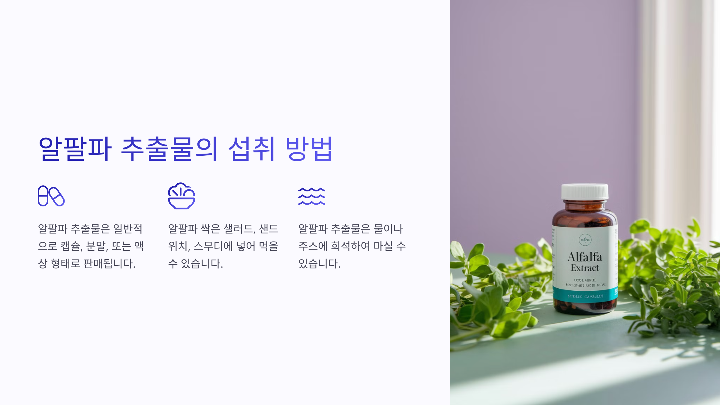 이처럼 알팔파추출물은 다양한 건강상의 이점을 제공해요. 그럼, 알팔파추출물을 어떻게 섭취하면 좋을까요? 다음 섹션에서 알아보도록 할게요!