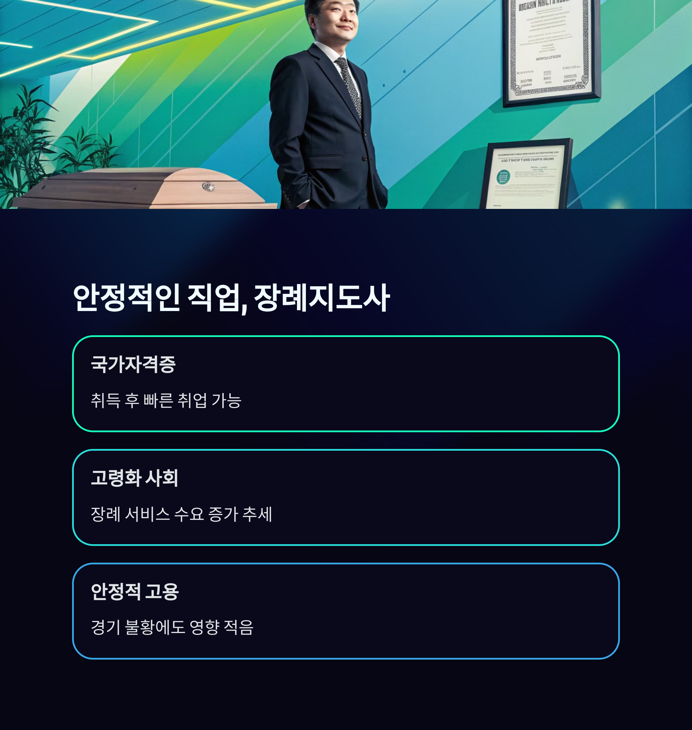 그리고 무엇보다 큰 장점은 직업의 소멸 가능성이 거의 없다는 점이에요. 삶의 마지막은 반드시 존재하기에, 이 직업은 어느 시대든, 어떤 기술 변화 속에서도 꼭 필요한 존재로 남게 될 거예요.