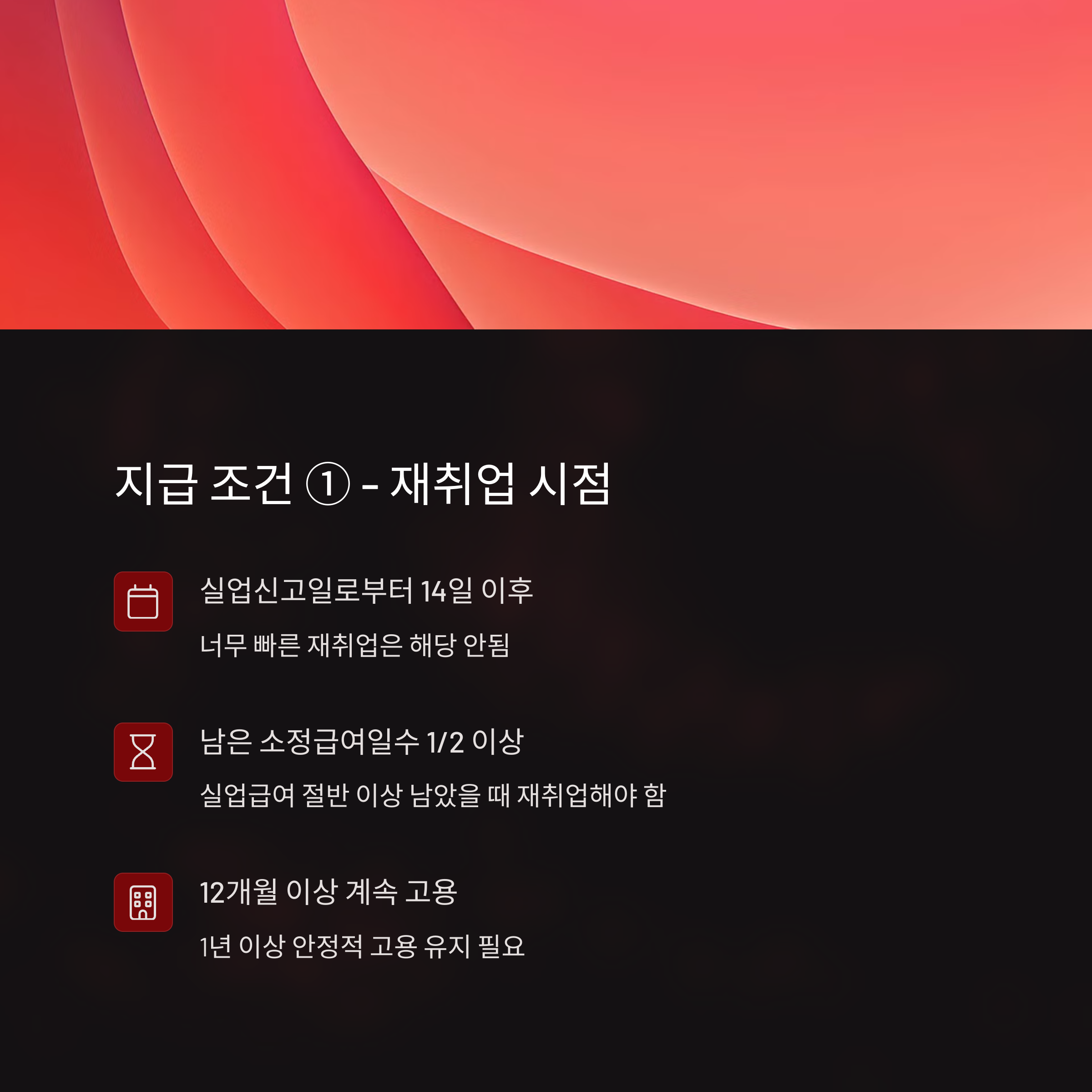 | ① 실업급여 수급 중 조기 취업 | 수급일수의 1/2 이상 남은 상태에서 취업 |