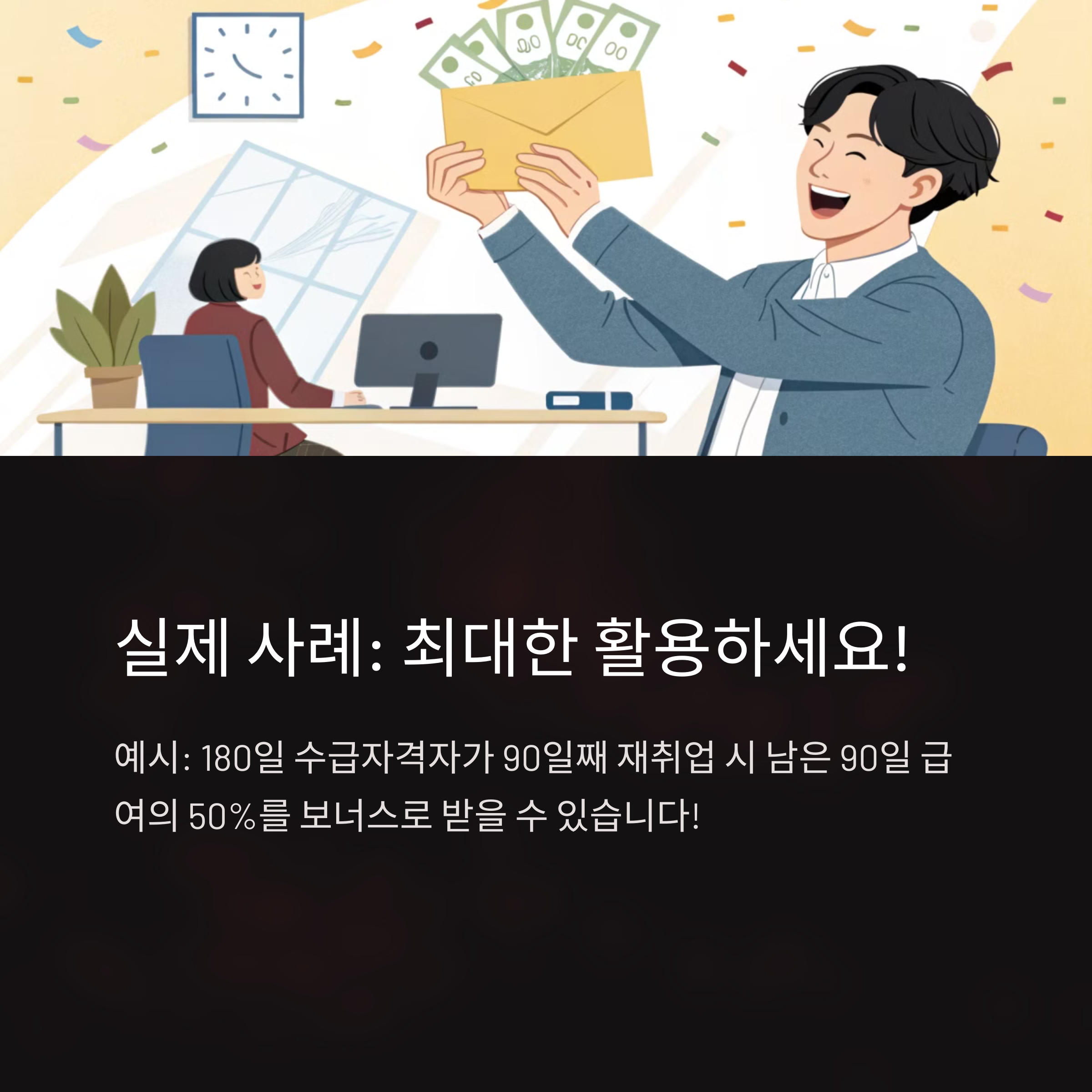 사례를 보면 알 수 있듯이, 수당은 정말로 '받을 준비가 되어 있는 사람'에게 주어져요. 단지 실업급여를 받는 것에서 끝나지 말고, **빠른 재취업 + 6개월 유지**라는 전략으로 수당까지 챙기는 게 똑똑한 방법이에요!