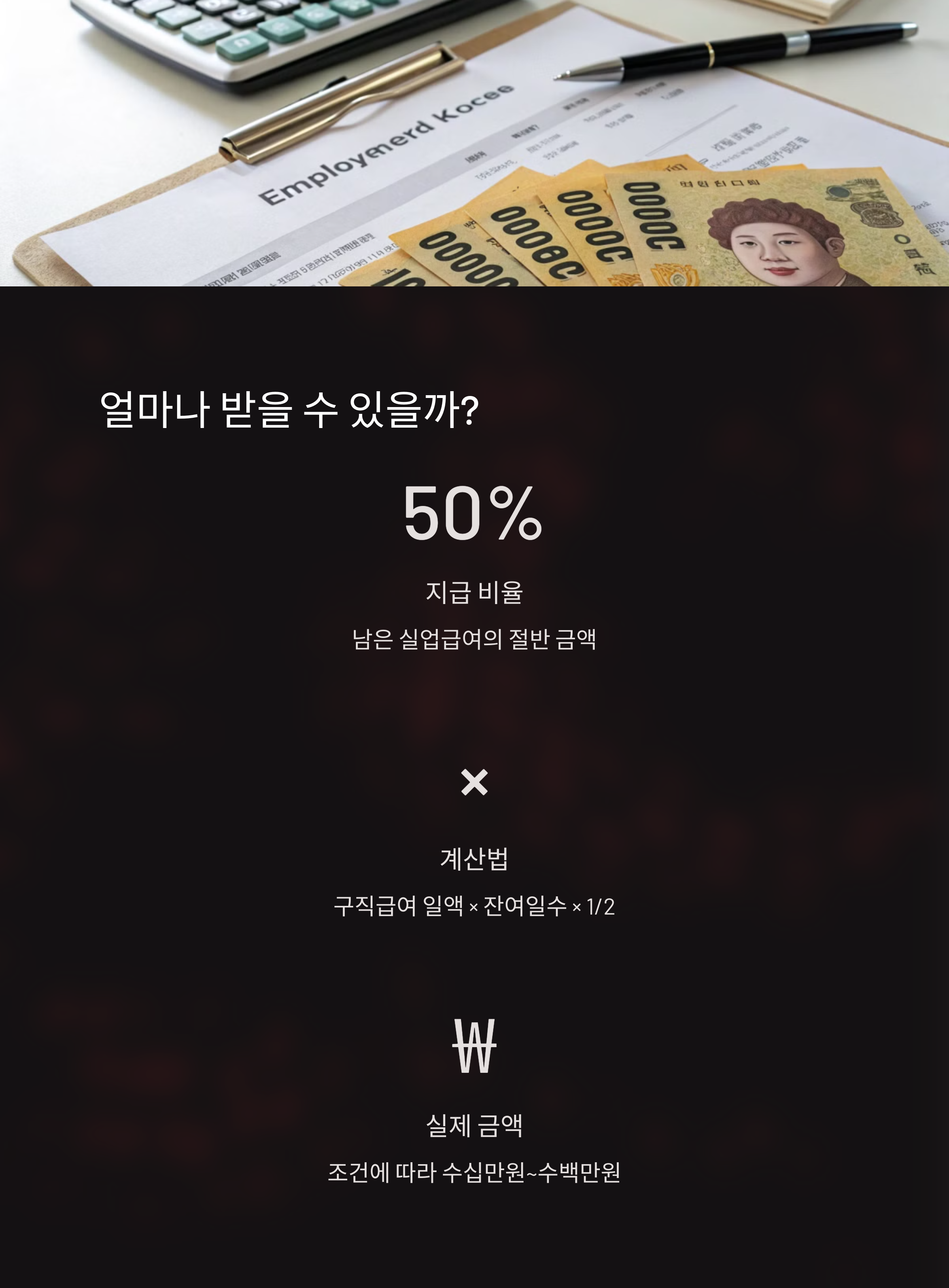 | 총 수급일수 | 수급 후 취업 시점 | 남은 일수 | 1일 지급액 | 예상 수당 |