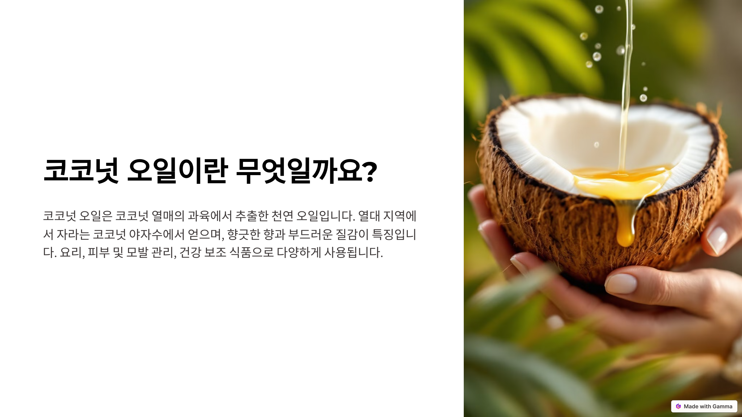 코코넛오일은 천연 보습제이자 항산화 성분이 풍부한 오일로, 피부와 모발 건강에 많은 이점을 제공해요. 특히, 건조한 피부를 촉촉하게 유지하고, 모발을 윤기 나게 가꾸는 데 탁월한 효과가 있어요.