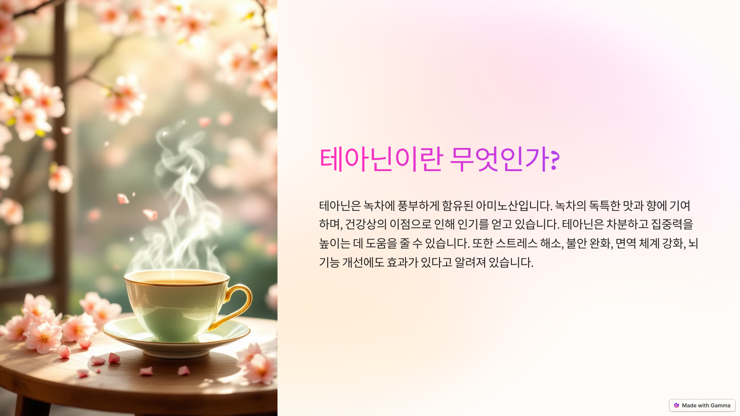 특히 테아닌은 신경계를 안정시키는 'GABA(감마 아미노부티르산)'의 생성을 돕는다고 알려져 있어요. GABA는 뇌의 흥분을 억제하고 긴장을 완화하는 중요한 역할을 해요.