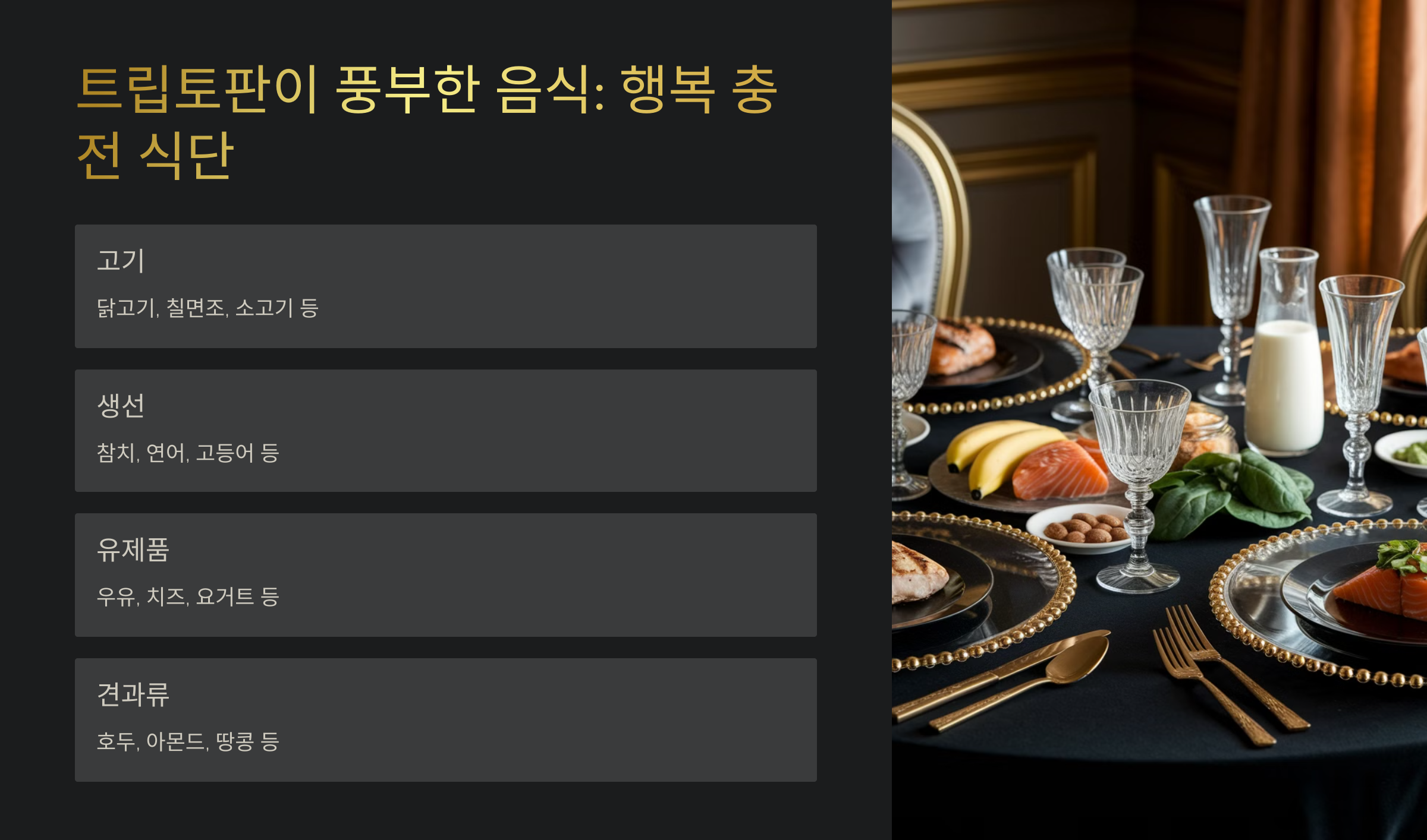 이런 음식들을 꾸준히 섭취하면 자연스럽게 트립토판을 보충할 수 있어요. 특히 **트립토판과 함께 비타민 B6, 마그네슘을 함께 섭취하면 세로토닌 합성이 더욱 원활해진답니다!**