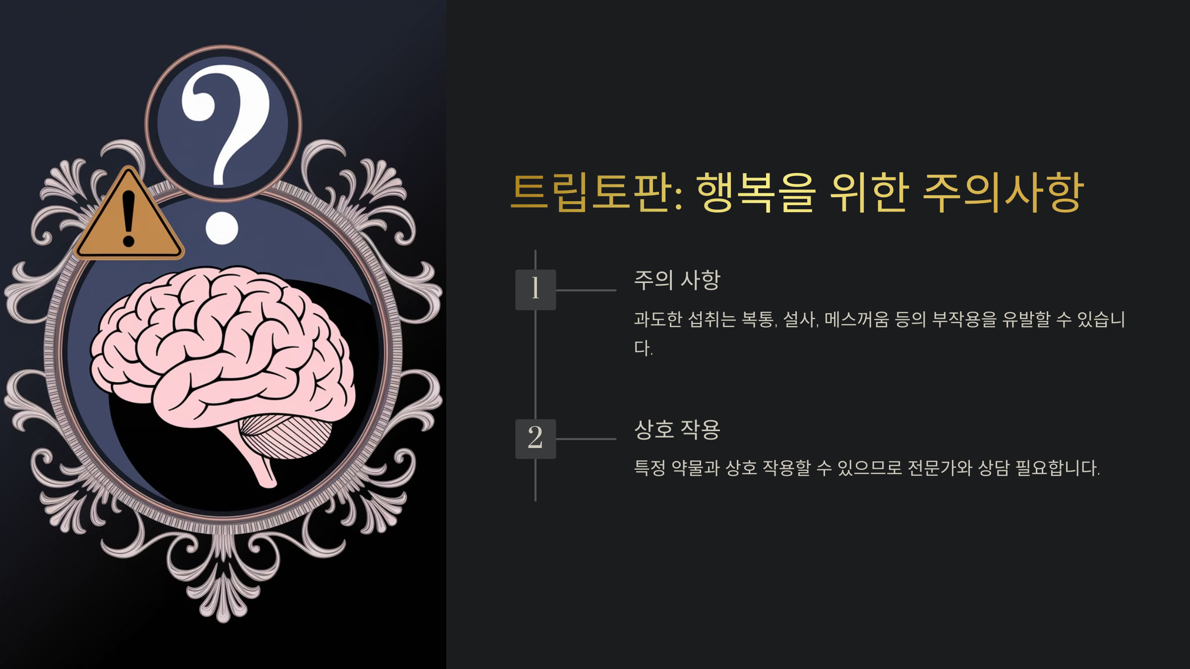 트립토판은 신체에 유익한 아미노산이지만, **과도한 섭취는 부작용을 유발할 수 있어요.** 특히 보충제를 사용할 경우, 개인의 체질과 건강 상태에 따라 부작용이 나타날 수도 있답니다.