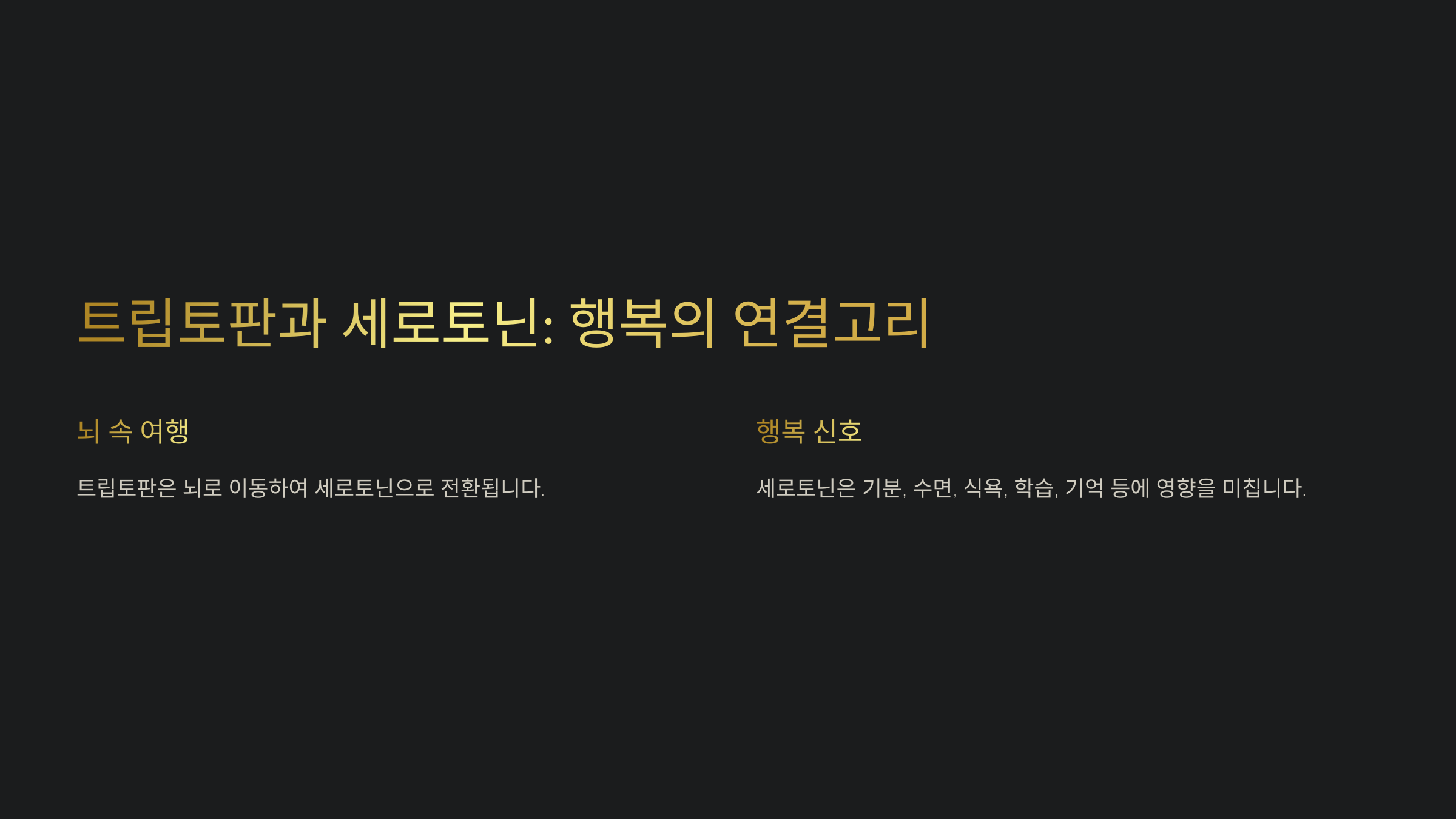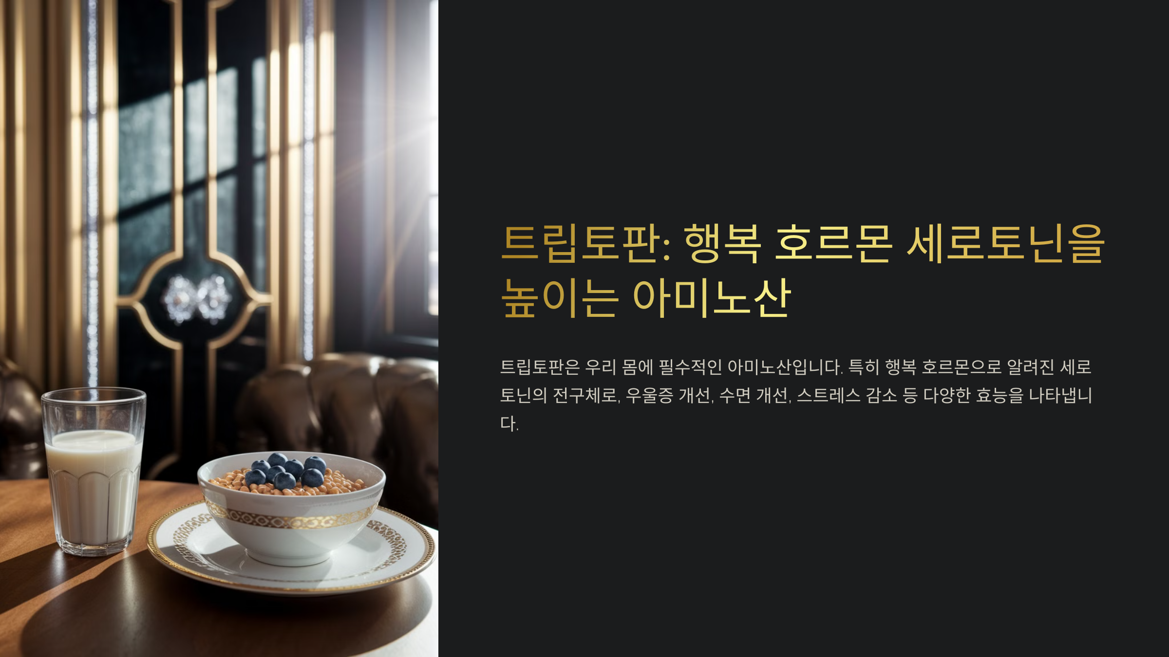 트립토판은 필수 아미노산 중 하나로, 신경전달물질인 세로토닌과 멜라토닌의 전구체 역할을 해요. 세로토닌은 '행복 호르몬'으로 불리며, 기분을 안정시키고 스트레스를 완화하는 데 중요한 역할을 하죠.