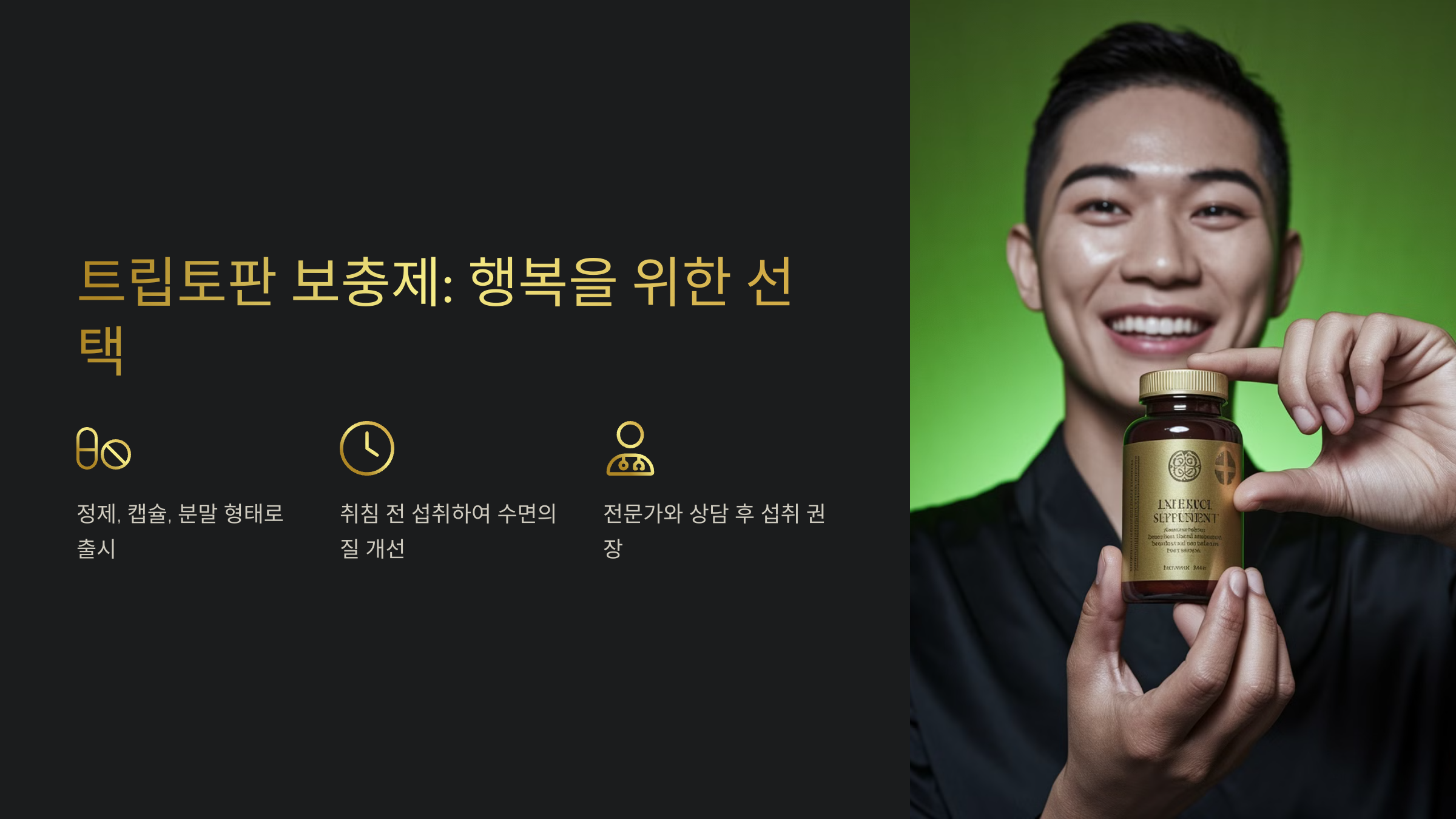 보충제를 선택할 때는 **5-HTP(5-하이드록시트립토판) 형태**가 많이 사용되는데, 이는 트립토판이 세로토닌으로 전환되는 중간 과정의 성분이라 효과가 빠르게 나타날 수 있어요.