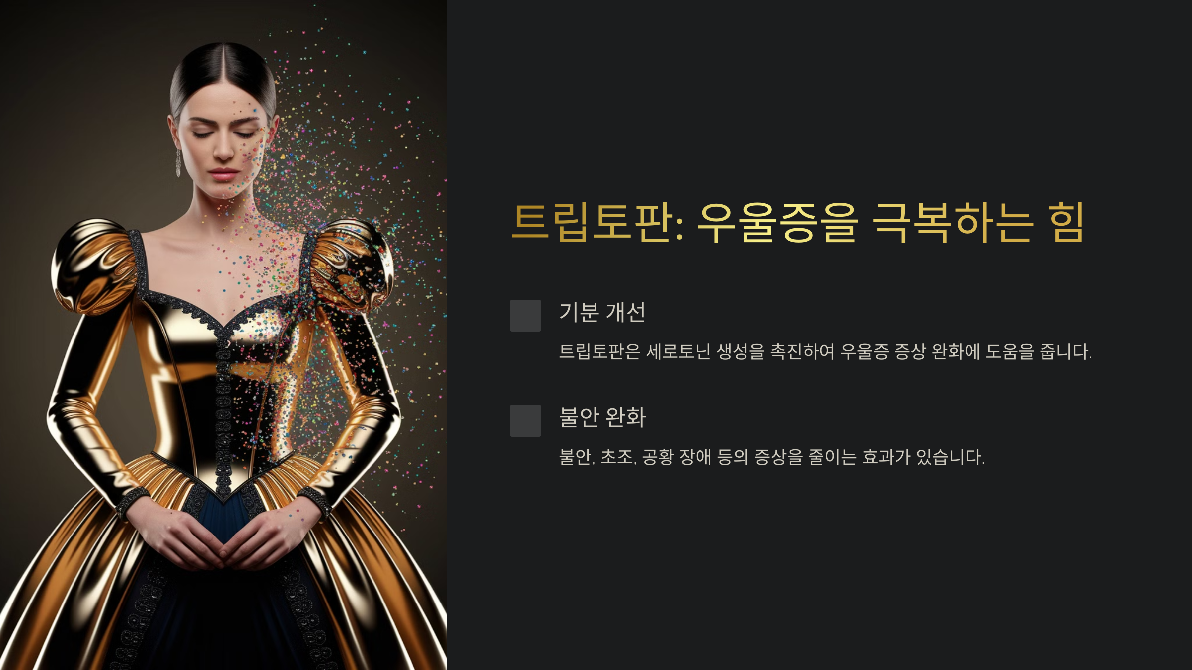 트립토판이 우울증 개선에 효과적인 이유는 바로 **세로토닌 증가** 때문이에요. 세로토닌이 충분하면 기분이 안정되고, 스트레스와 불안이 줄어들어요. 그래서 트립토판이 풍부한 식단은 자연스럽게 우울증 증상을 완화하는 데 도움이 될 수 있어요.