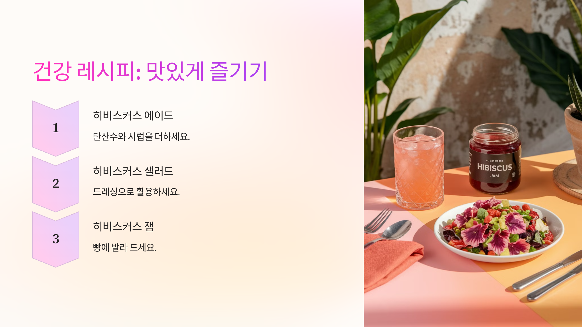 히비스커스는 차뿐만 아니라 다양한 방법으로 활용할 수 있어요. 오늘은 히비스커스를 더 맛있고 건강하게 즐길 수 있는 레시피를 소개할게요!
