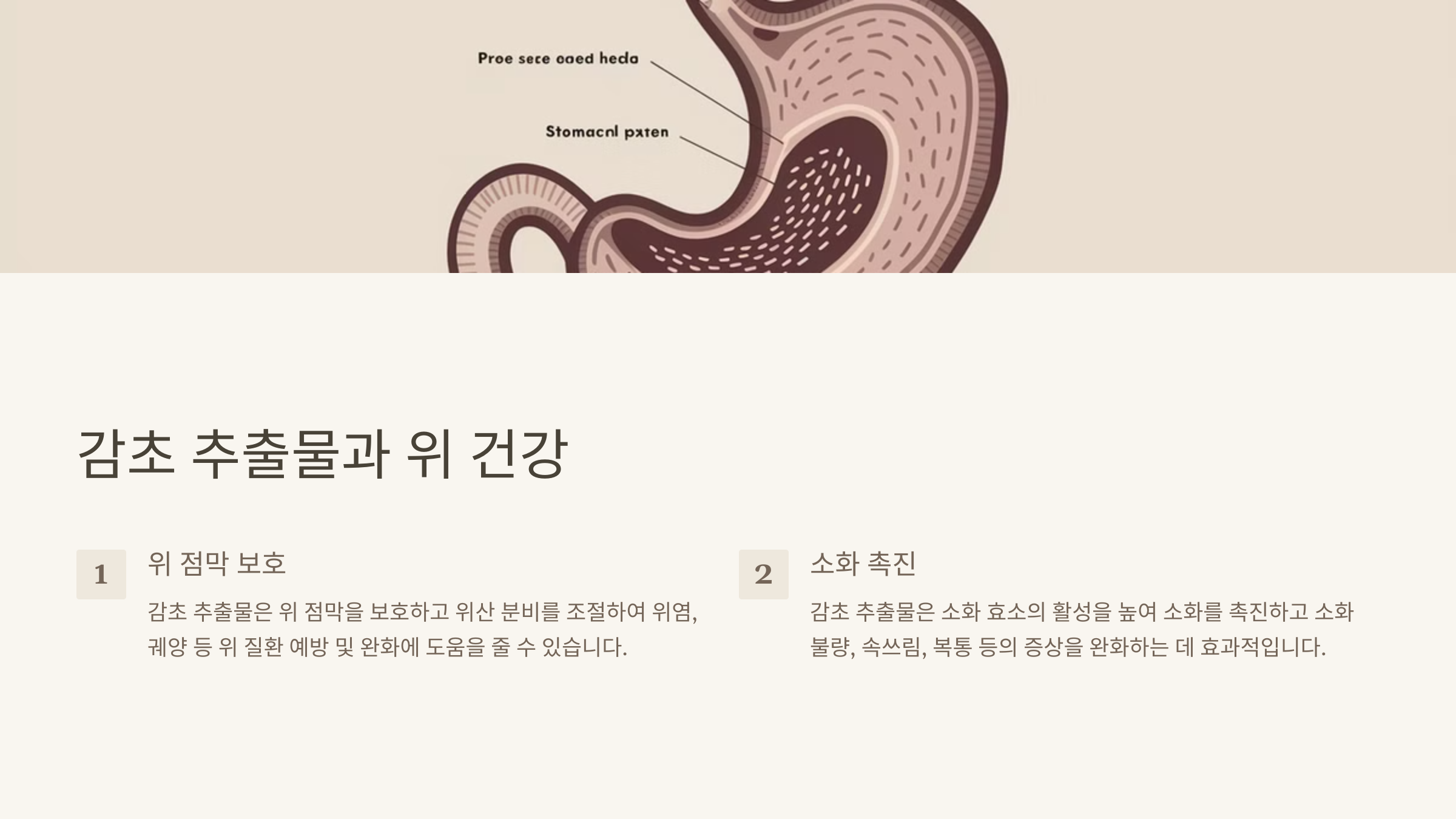 💡 **감초추출물은 위 건강뿐만 아니라 면역력과 간 기능 보호에도 탁월한 효과를 발휘하는 천연 보조제예요!**