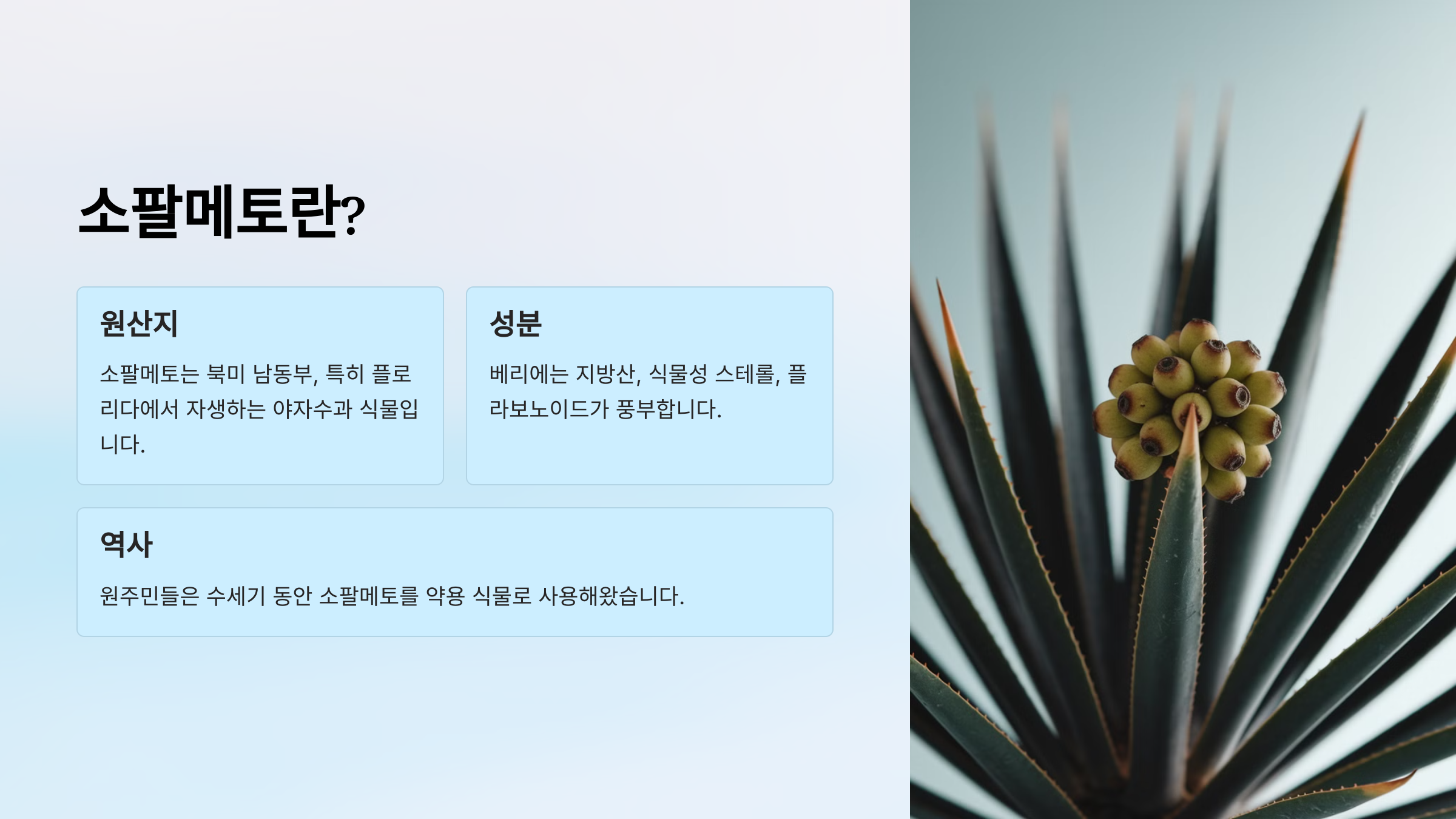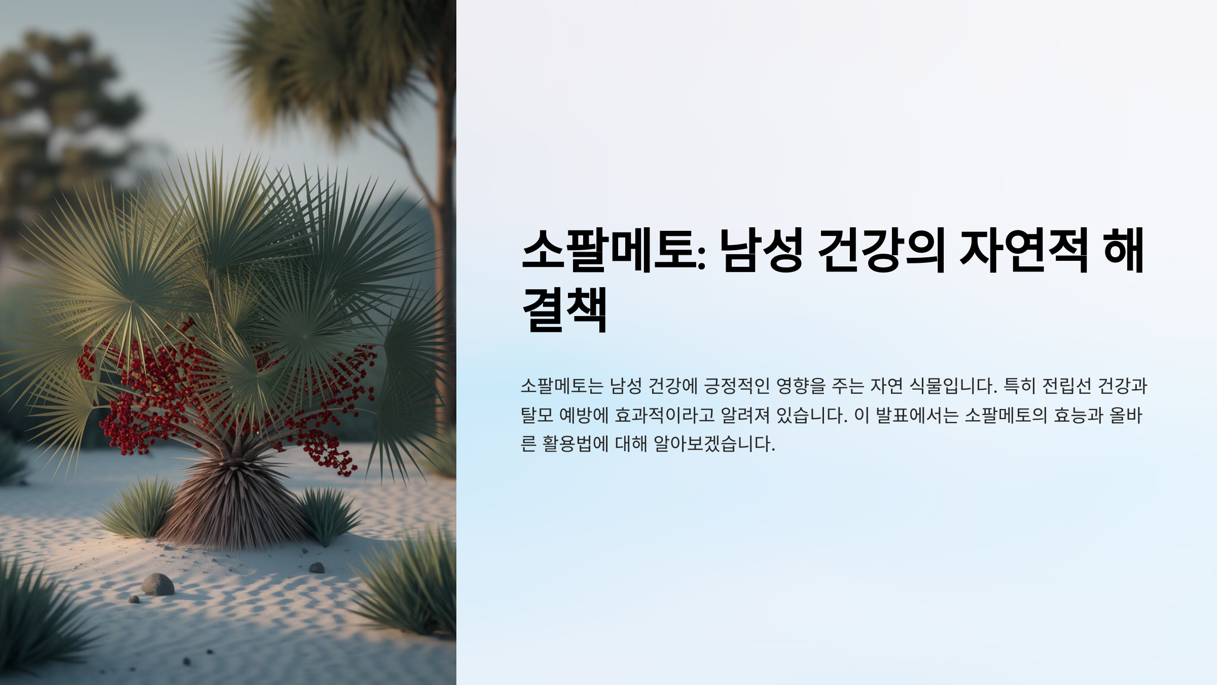 소팔메토(Saw Palmetto)는 전립선 건강과 탈모 예방에 효과가 있는 천연 성분으로, 주로 남성 건강을 위해 많이 사용돼요. 하지만 최근에는 여성 탈모 예방에도 주목받고 있답니다. 🌱✨