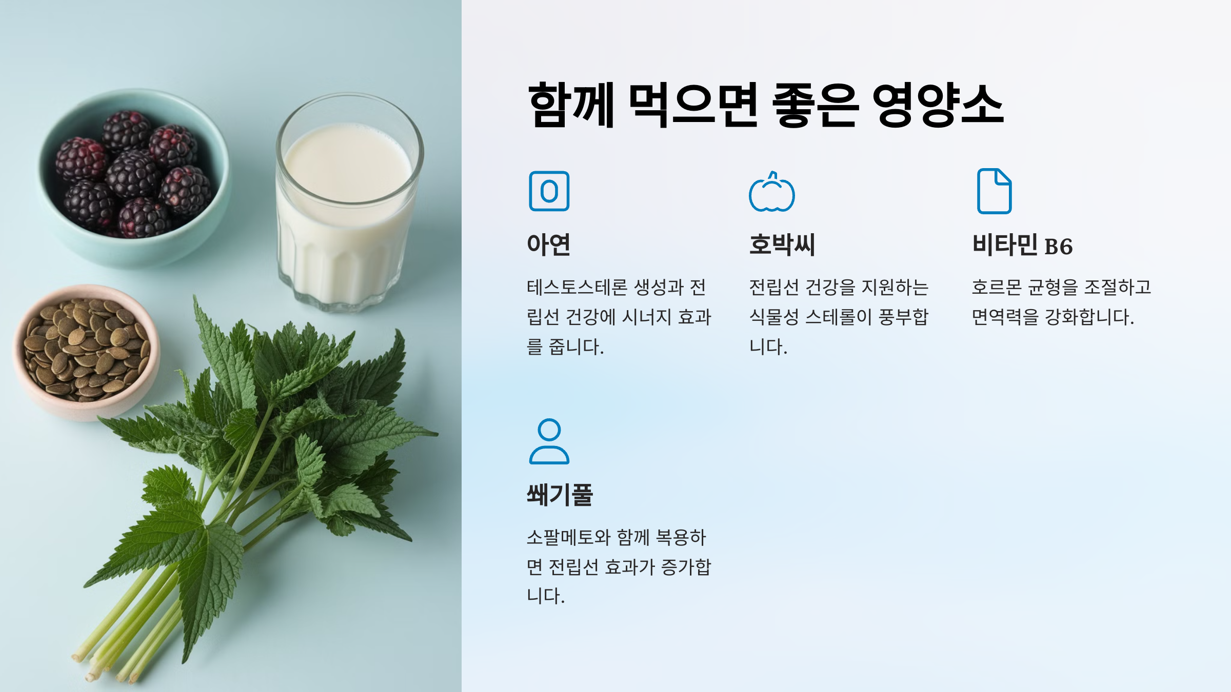 특히 **아연과 오메가-3는 소팔메토와 함께 섭취하면 전립선 건강과 탈모 예방에 더욱 효과적**이에요! 💙