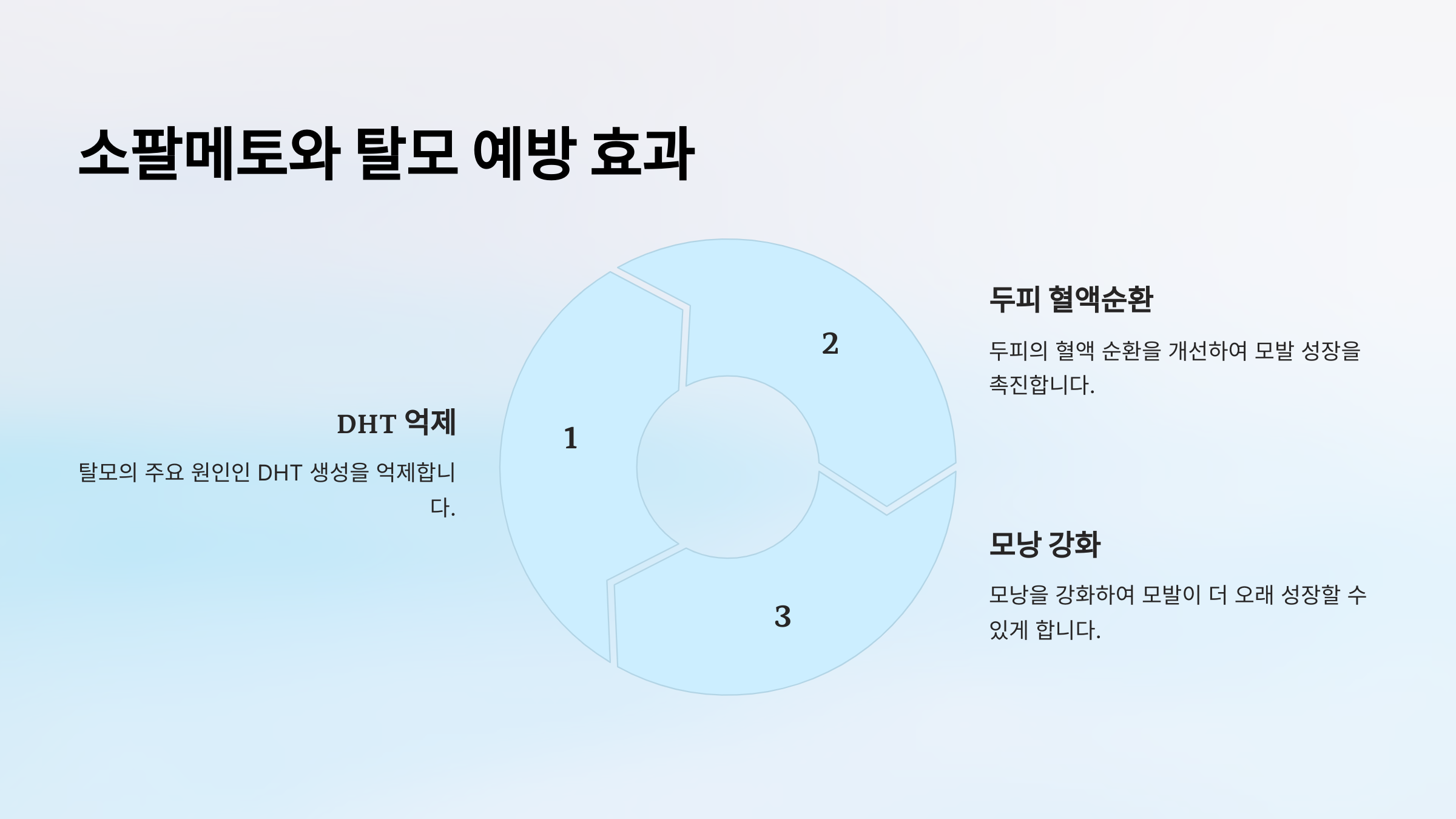 | DHT 억제 | DHT가 모낭을 축소시키는 작용을 막아 탈모 진행을 늦춤 |