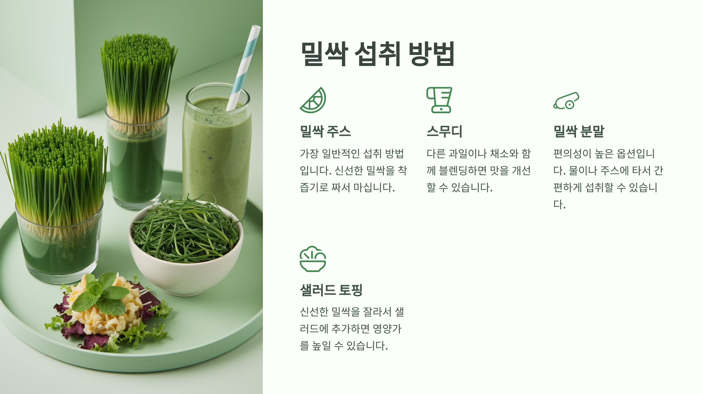 | 🌿 생 밀싹 | 1~2 스푼 | 샐러드, 스무디에 추가 |
