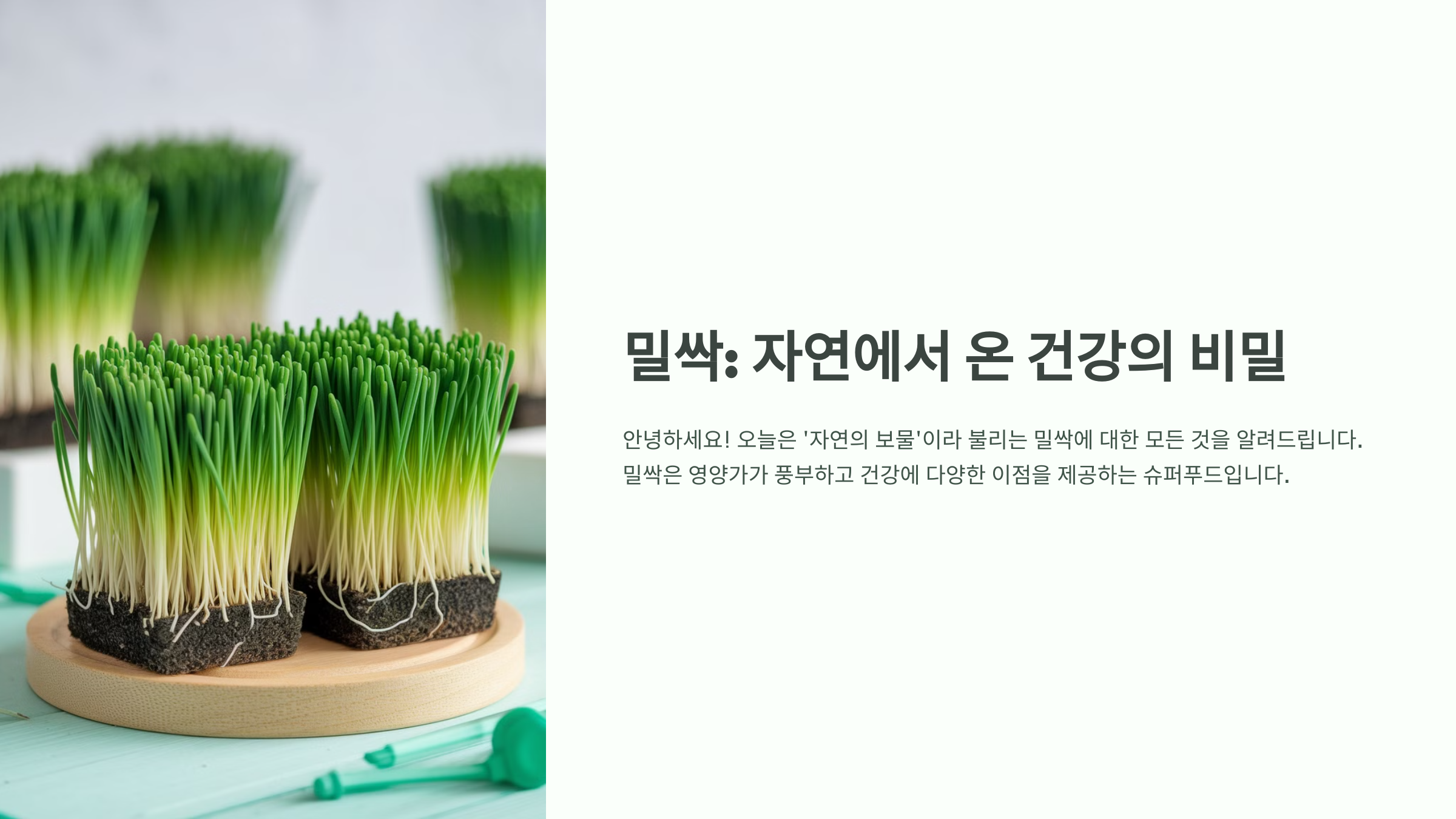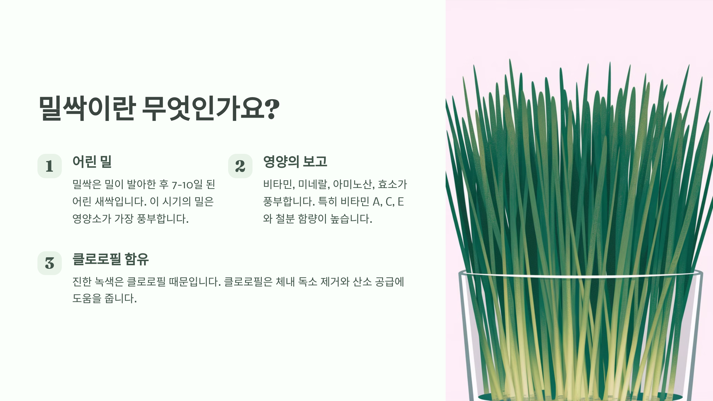 밀싹(Wheatgrass)은 밀의 어린 새싹으로, **클로로필(엽록소), 비타민, 미네랄이 풍부한 슈퍼푸드**로 유명해요. 🌱