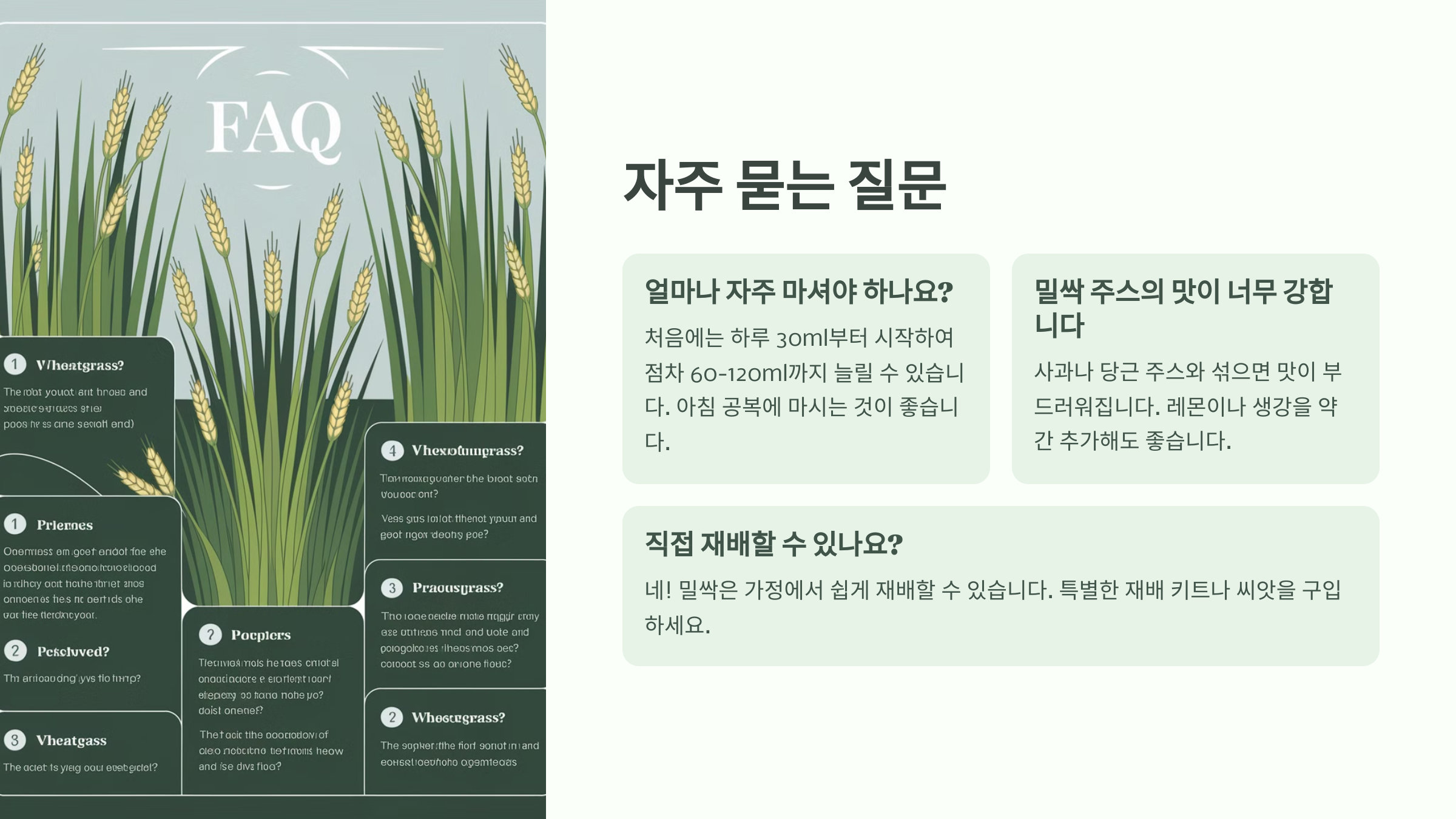 A7. 밀싹의 영양소(특히 클로로필)는 **열에 약하기 때문에 가열하지 않고 섭취하는 것이 가장 좋아요.** 주스나 스무디로 먹는 것이 효과적이에요. 🌿