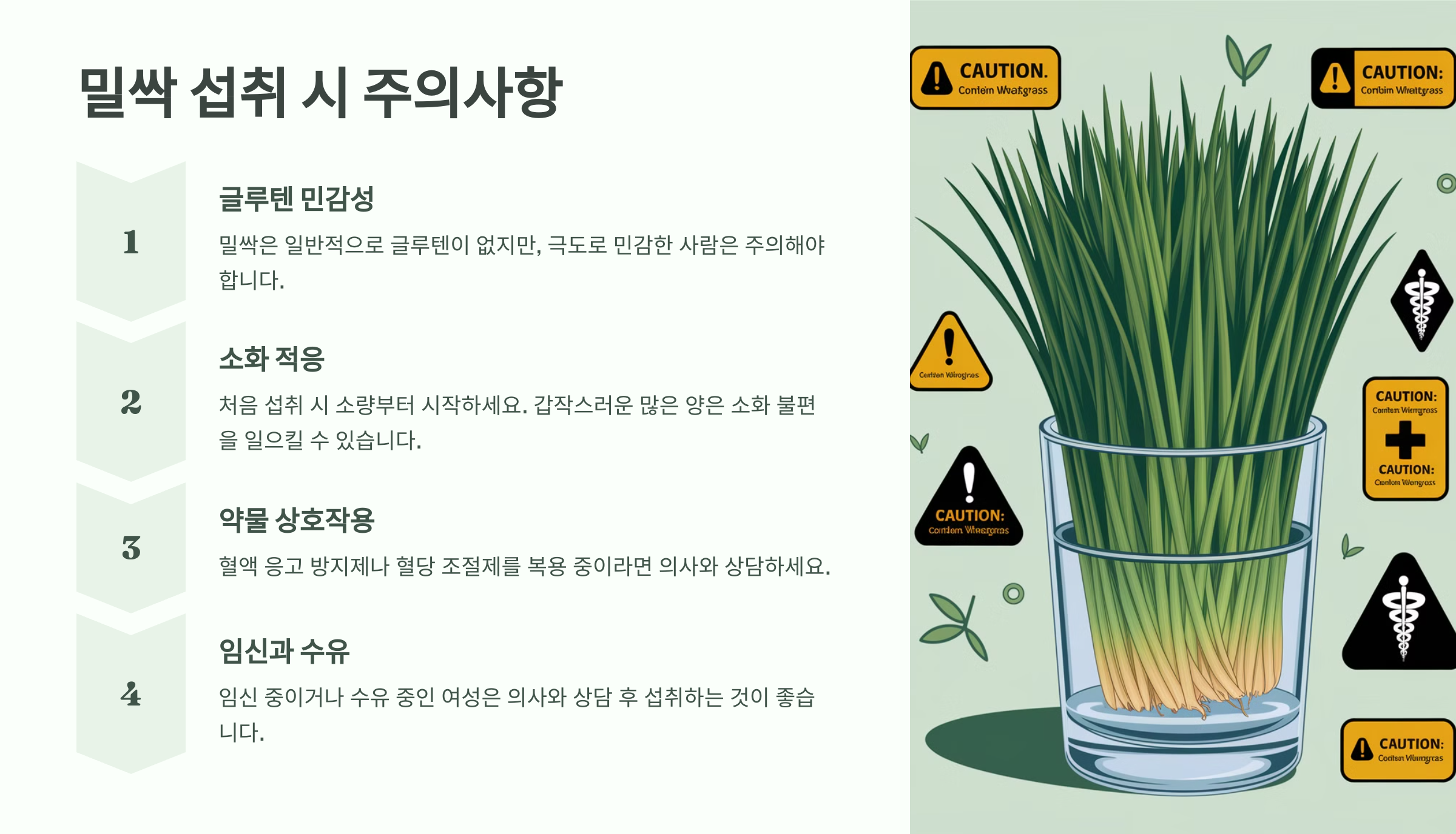 하지만, 밀싹을 섭취할 때 몇 가지 주의해야 할 점도 있어요. 🚨