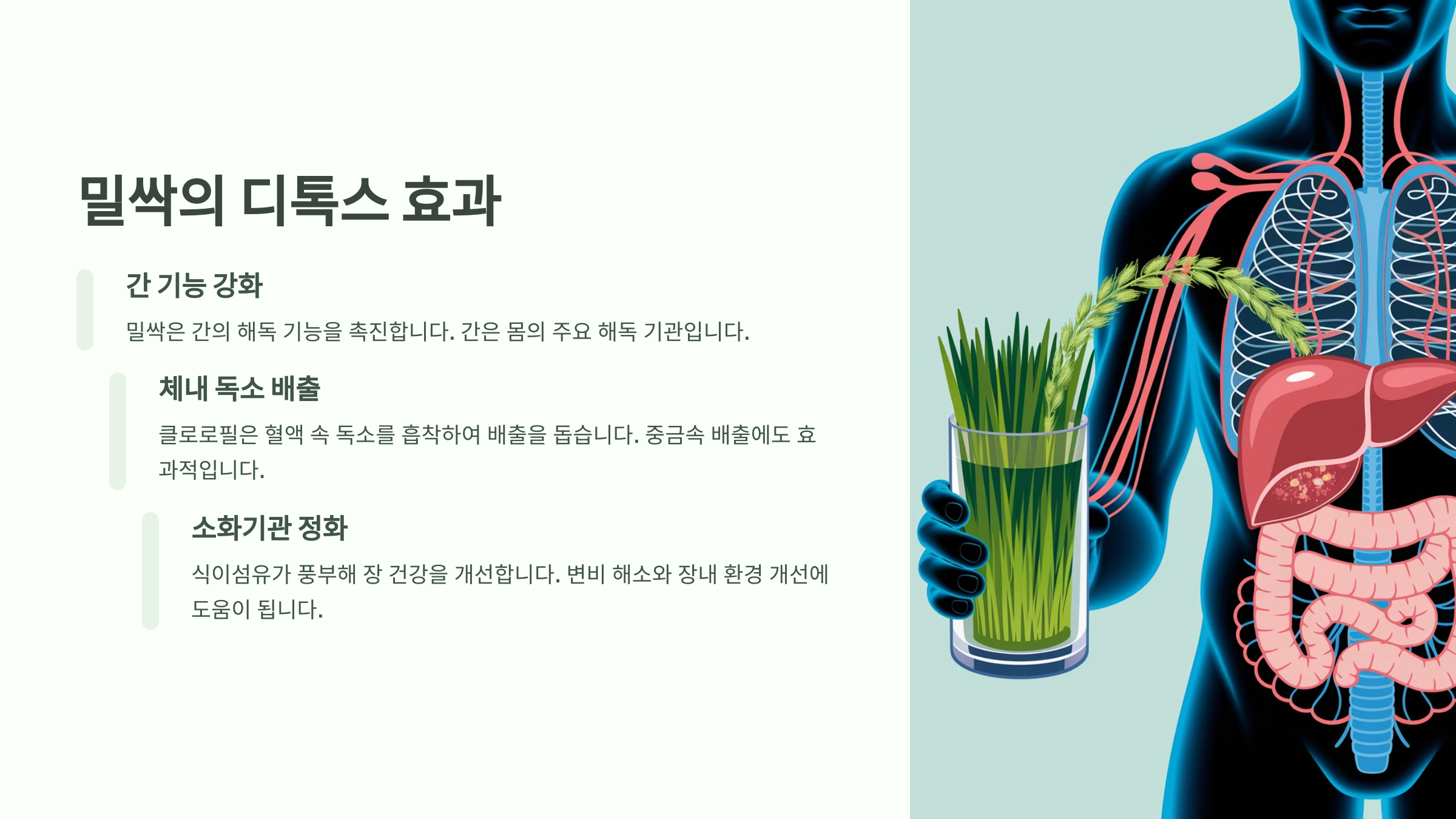 | 간 해독 | 클로로필이 간 기능을 활성화하고, 독소 배출 촉진 |
