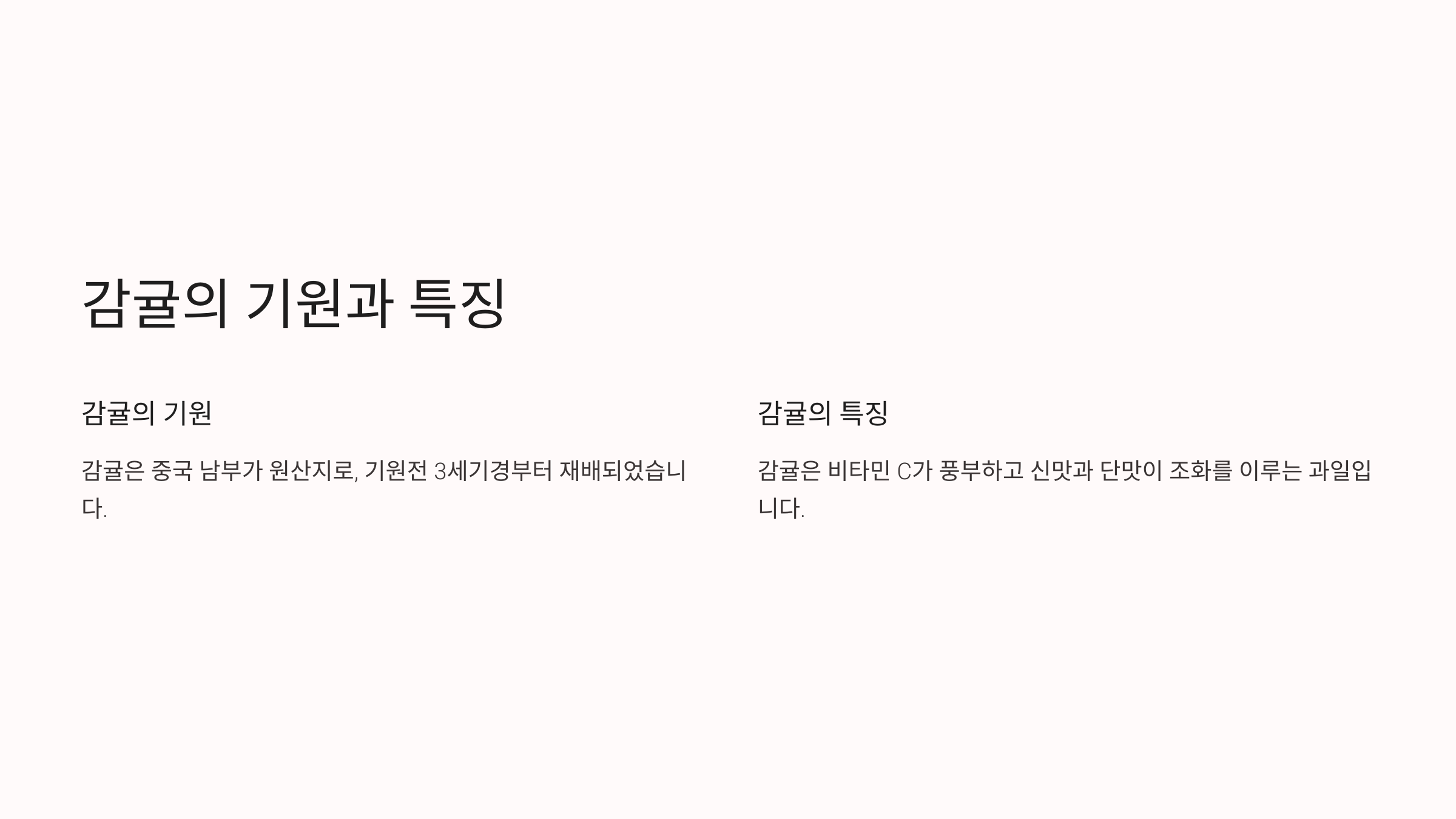 감귤은 오랜 역사를 가진 과일로, 원산지는 **동남아시아와 인도 북부**로 알려져 있어요. 이후 실크로드를 따라 중국, 일본, 한국 등지로 전파되었으며, 지금은 세계 여러 나라에서 재배되고 있죠. 특히 한국의 **제주도 감귤**은 품질이 우수한 것으로 유명해요.