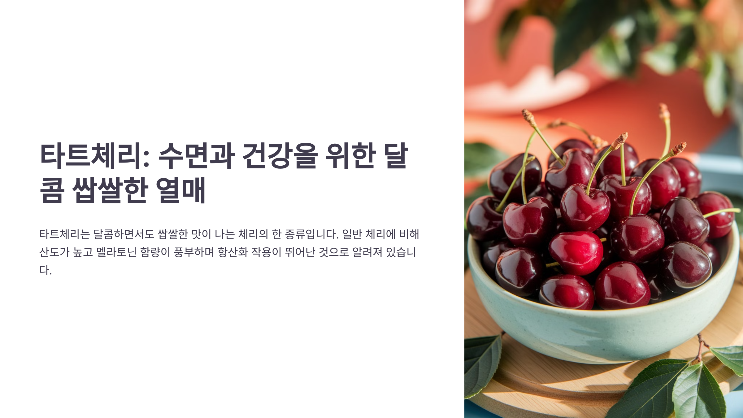 그렇다면, 타트체리가 왜 수면 개선에 효과적인지, 어떤 방식으로 섭취해야 하는지, 과학적으로 입증된 연구 사례까지 자세히 알아볼까요?