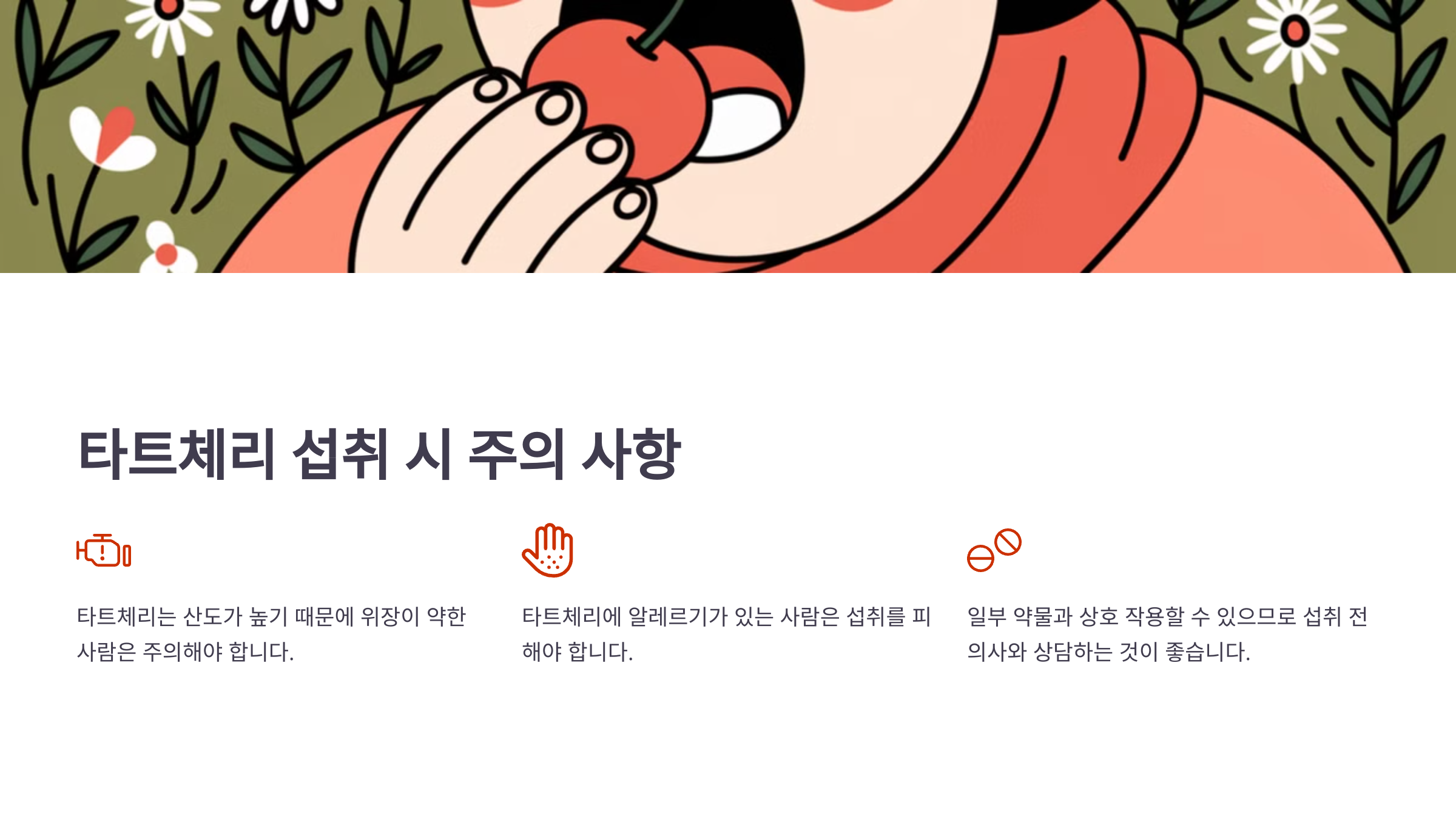 - 🚫 과다 섭취 시 위장 장애: 타트체리는 신맛이 강해 위가 약한 사람은 속 쓰림을 경험할 수 있어요.