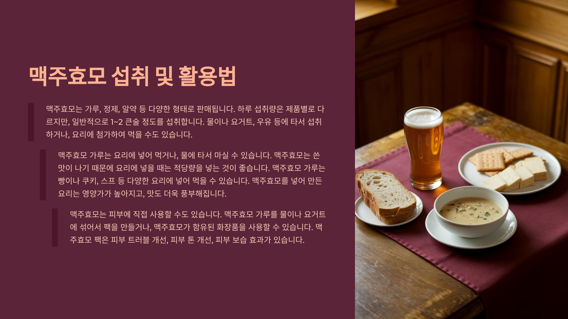 👉 **다음 섹션에서는 "맥주효모 섭취 및 활용법"을 알아볼게요!** 🍽️