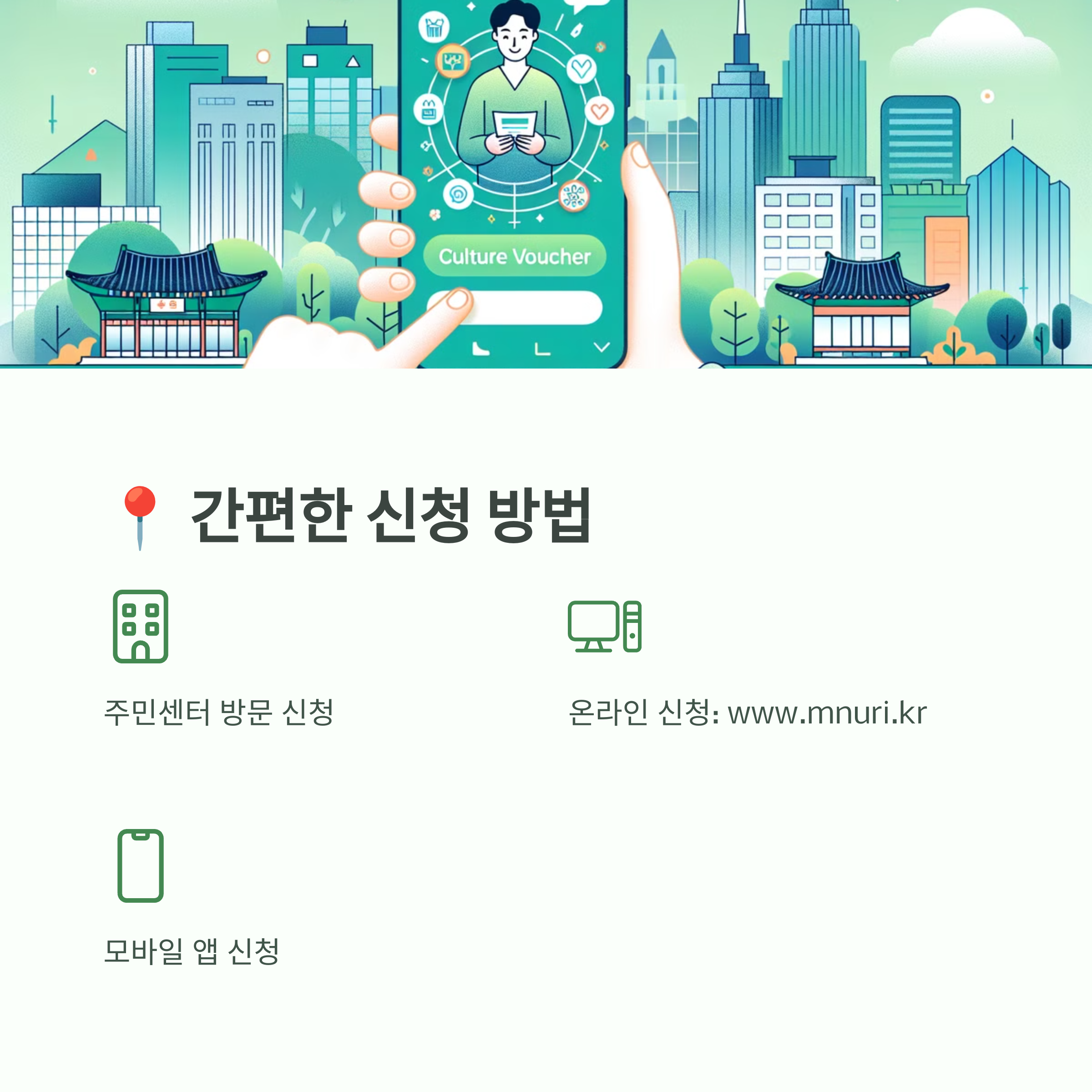 📌 온라인 신청은 문화누리카드 홈페이지에서 간편하게 할 수 있어요! 방문 신청을 원한다면 가까운 주민센터에 가면 됩니다. 😊