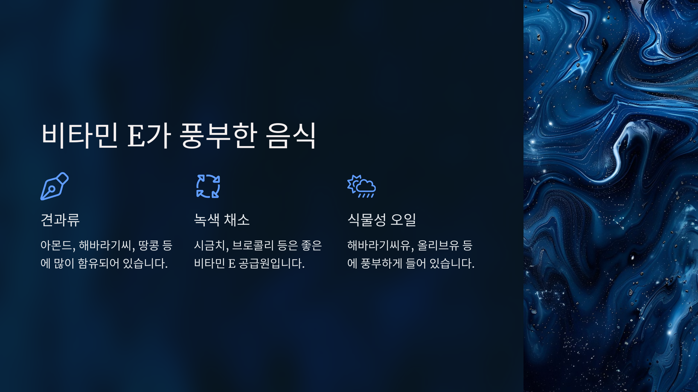 📢 다음 섹션에서는 **비타민 E가 풍부한 음식**을 소개해 드릴게요!