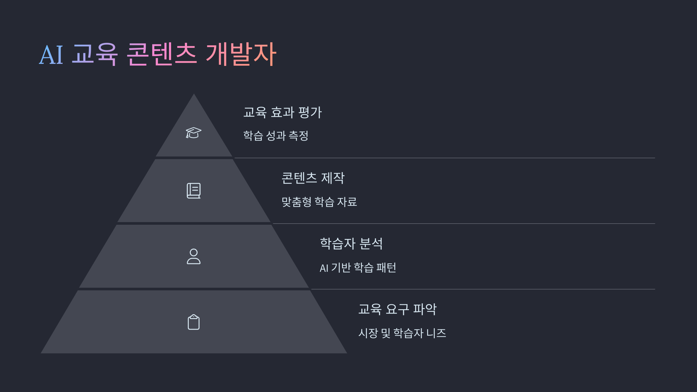 에듀테크와 사내 교육 시장의 성장은 ‘AI 교육 콘텐츠 개발자’라는 새로운 직무를 만들었어요. 특히 GPT 기반 커리큘럼, 실습자료 제작 경험이 있는 사람은 매우 선호돼요.