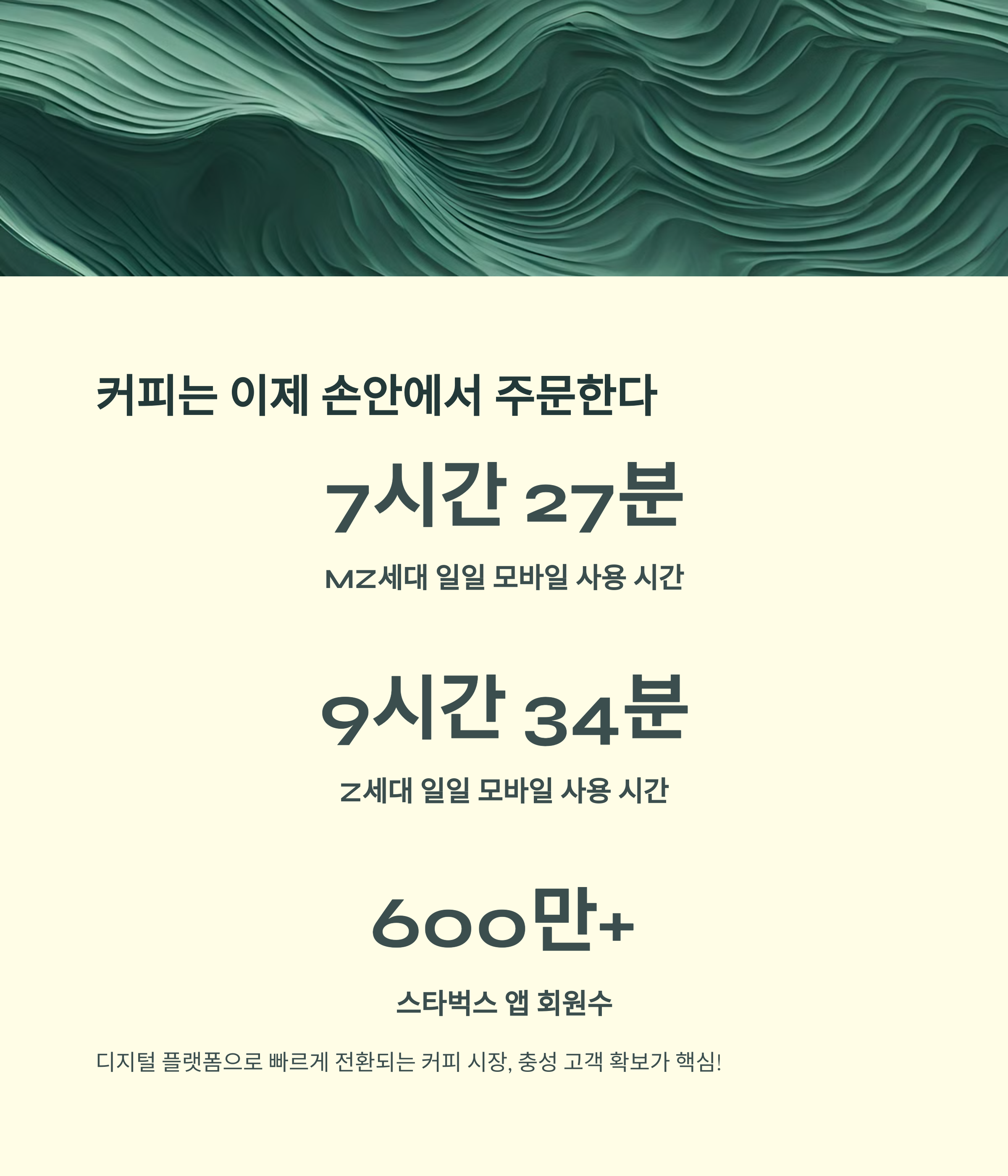 MZ세대는 빠르고 간편하면서도 나만의 경험을 중요시해요. 앱 중심의 커피 소비는 이 모든 걸 만족시켜 주는 트렌드의 중심이에요. 🤳☕