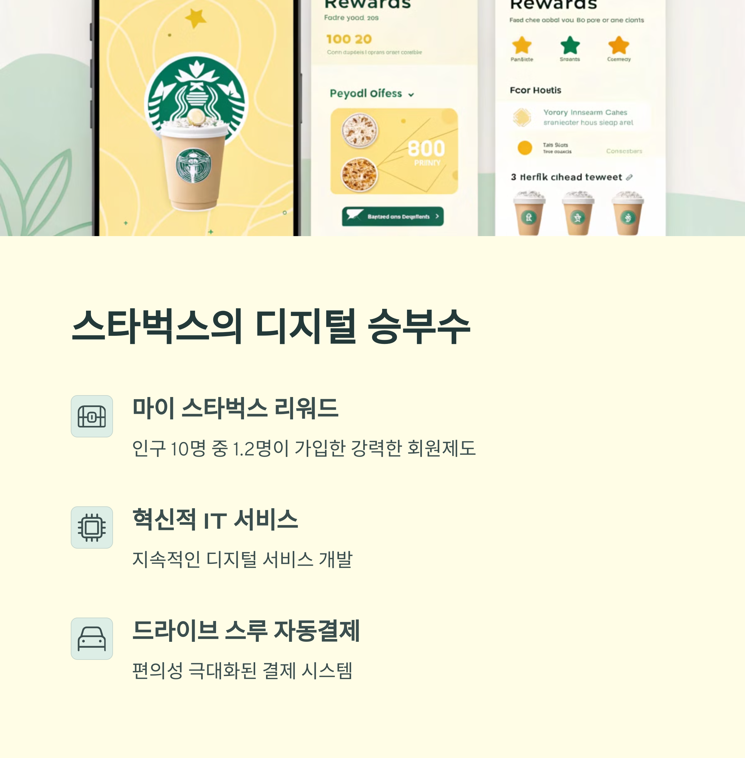 스타벅스는 이미 앱 생태계를 탄탄히 구축했어요. 전체 주문 중 무려 35%가 앱을 통해 이뤄지고 있고, 사이렌 오더를 통해 오프라인 대기 시간을 최소화했죠. 이 시스템 하나만으로도 유저 만족도가 높아요. 게다가 앱 전용 리워드와 커스텀 음료 기능까지, 앱 사용을 유도할 수밖에 없는 구조예요.