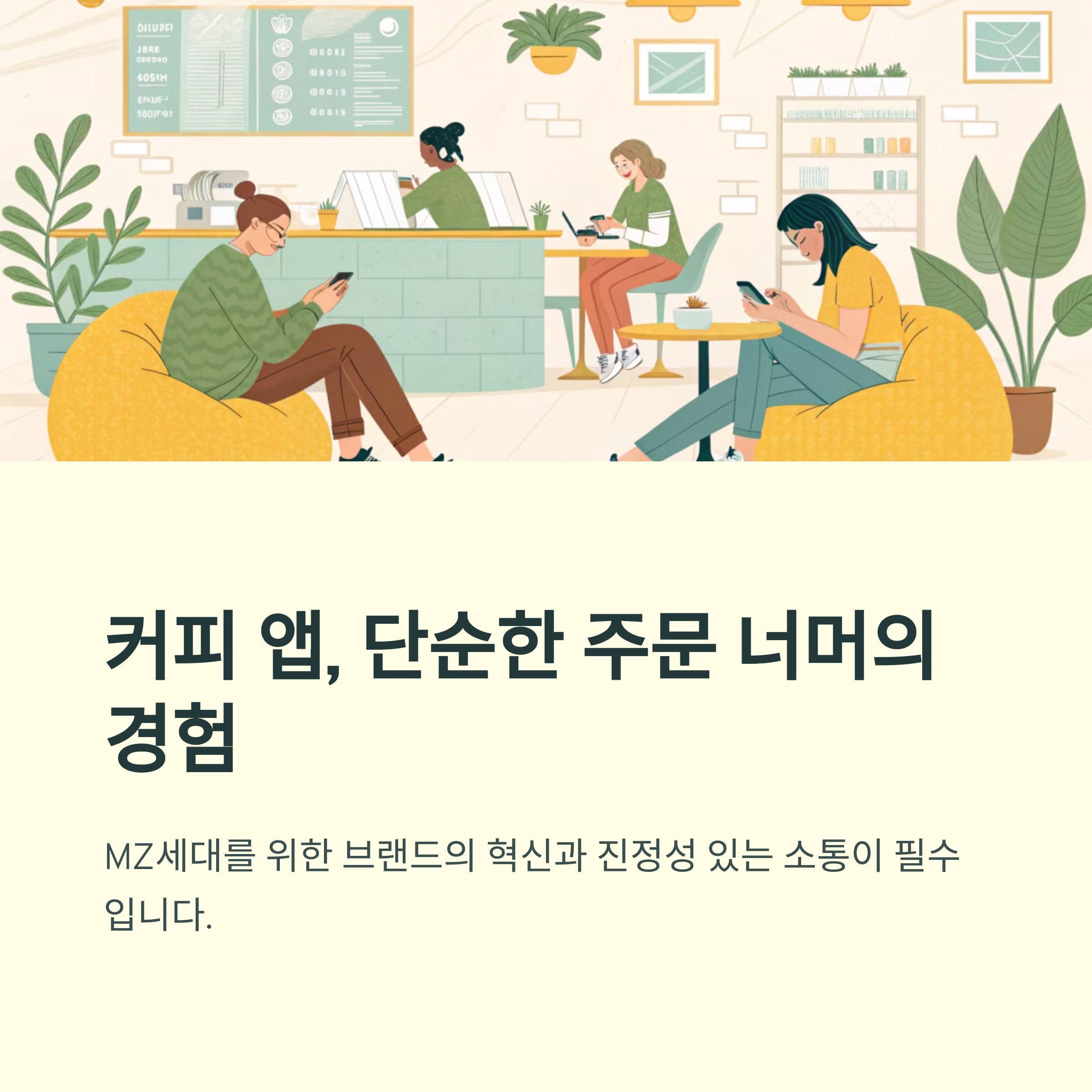 MZ세대는 빠르고 간편하면서도 나만의 경험을 중요시해요. 앱 중심의 커피 소비는 이 모든 걸 만족시켜 주는 트렌드의 중심이에요. 🤳☕
