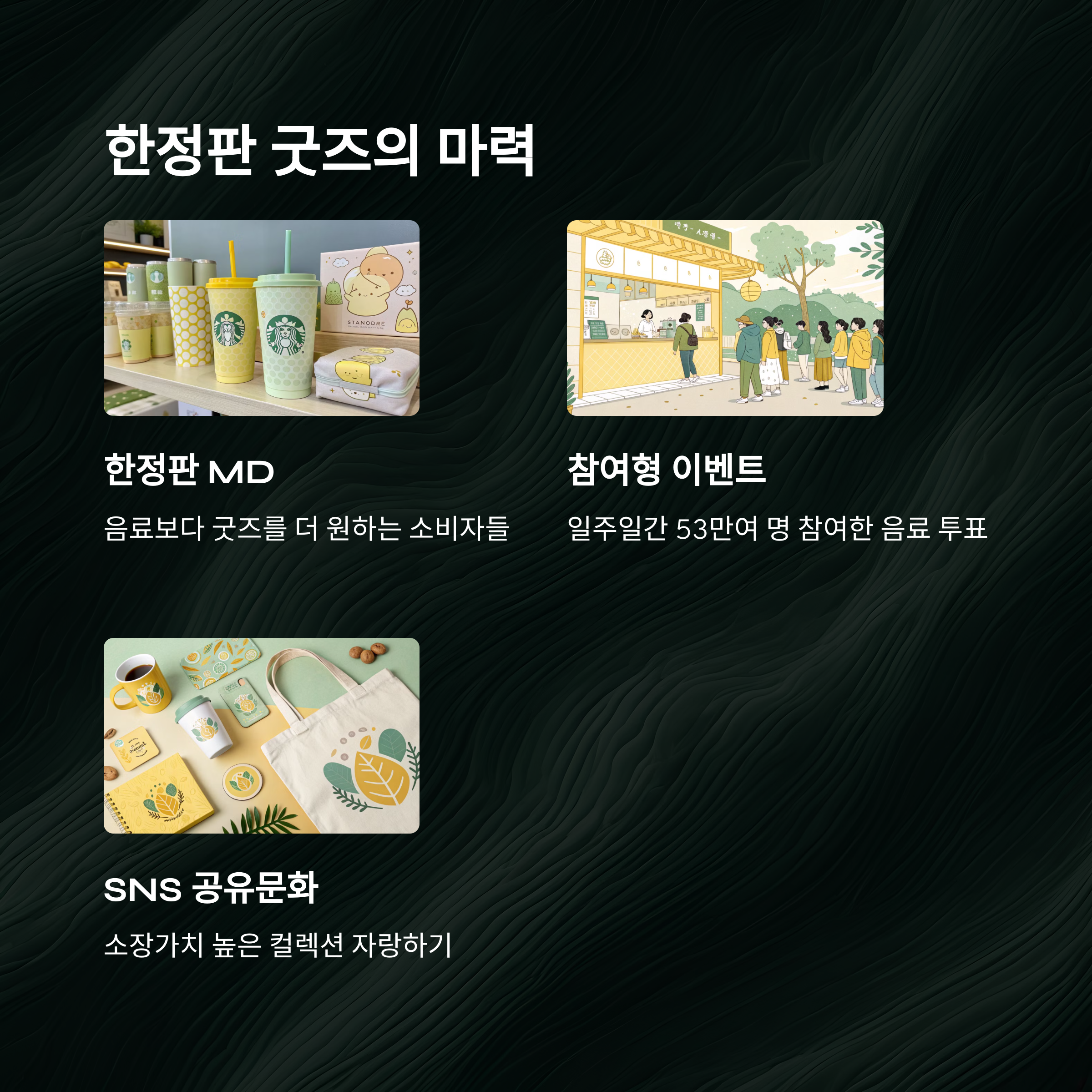 앱의 사용성을 넘어, 팬덤을 만드는 구조가 탄생한 거죠. 요즘은 커피보다 MD가 더 인기인 경우도 많아요. 앱을 중심으로 마케팅이 재편된 셈이에요. ☕📲