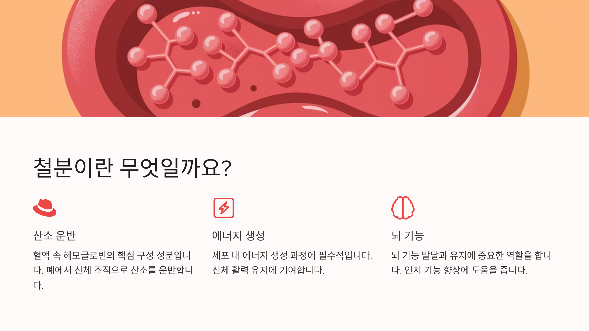 철분(Iron)은 우리 몸에서 혈액을 통해 산소를 운반하는 데 필수적인 미네랄이에요. 또한 에너지 생성, 면역 기능, DNA 합성에도 중요한 역할을 해요.