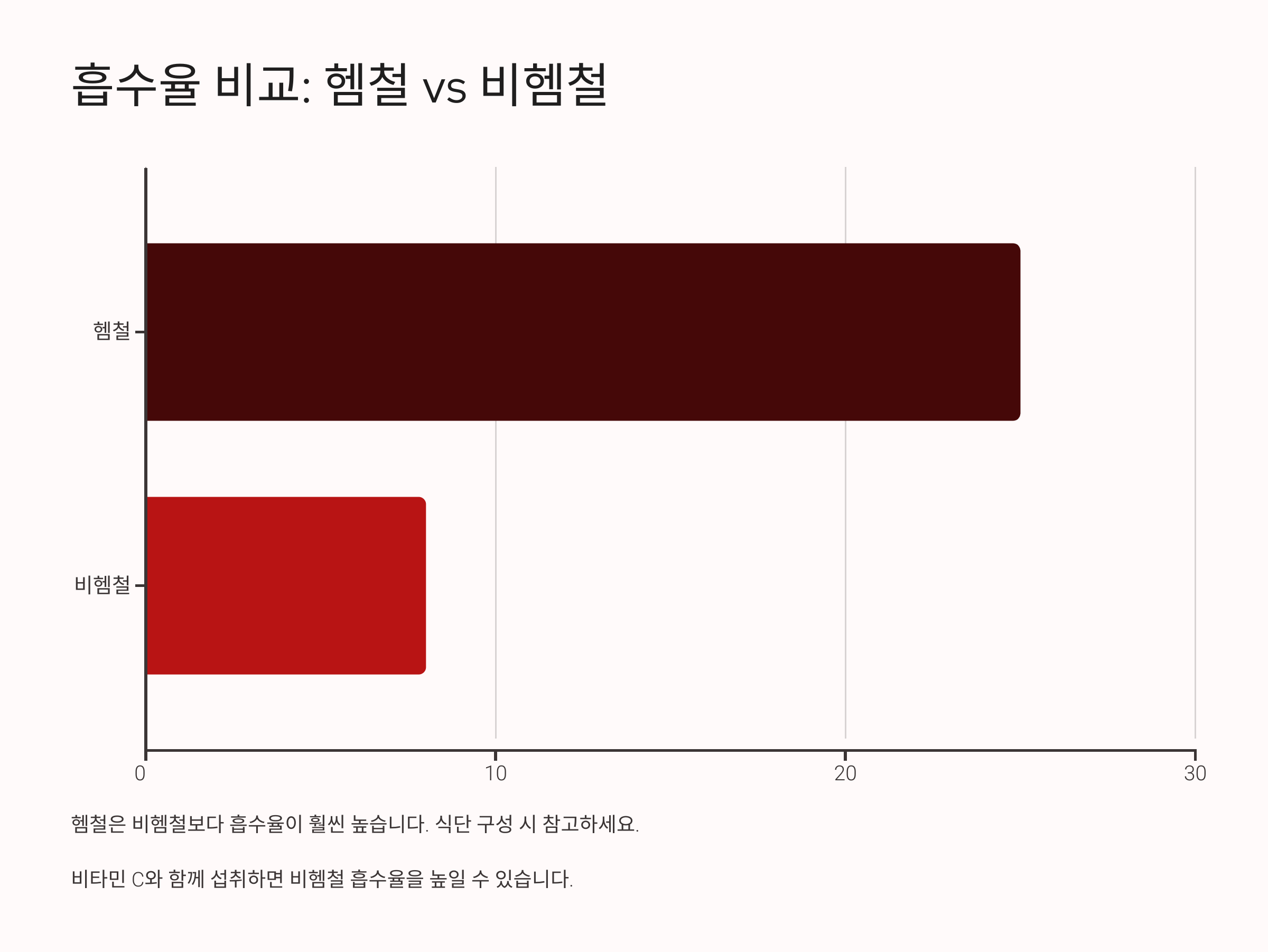 헴철과 비헴철의 가장 큰 차이점은 흡수율이에요. 헴철은 15~35%의 높은 흡수율을 보이지만, 비헴철은 2~20%로 흡수율이 낮아요. 따라서 비헴철을 섭취할 때는 흡수를 도와줄 성분과 함께 먹는 것이 중요해요! 😊